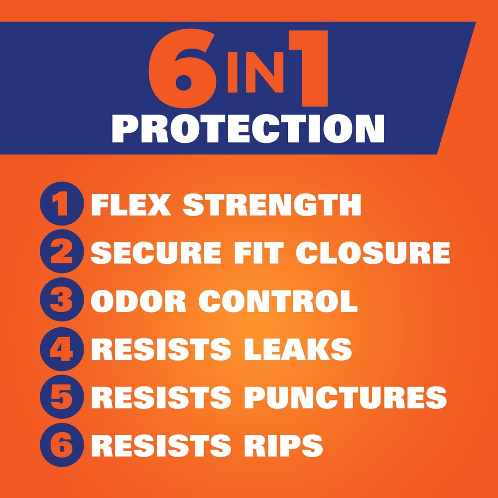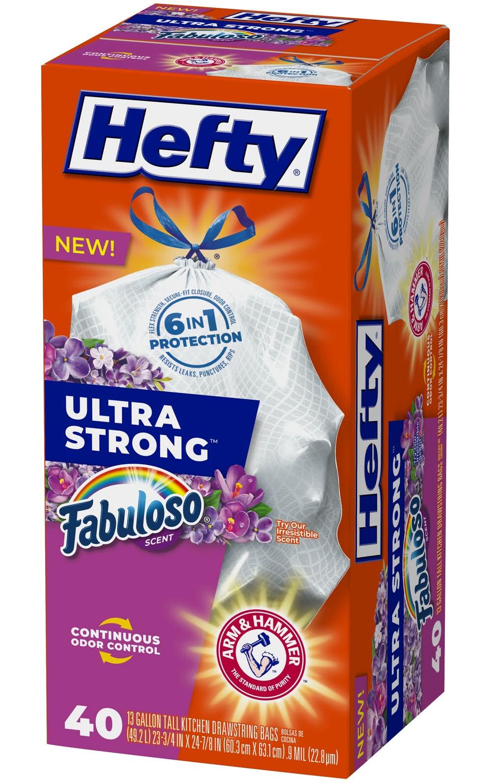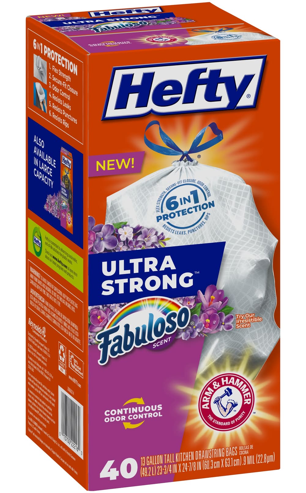 Continuous Odor Control. TOUGHNESS YOU CAN TRUST—Hefty’s strongest tall kitchen trash bags deliver toughness you can trust with a secure, break-resistant drawstring and superior durability. Arm & Hammer CONTINUOUS ODOR CONTROL AND FABULOSO SCENT—Patented odor control, paired for the first time with the joyful scent of Fabuloso, leverages the power of Arm & Hammer to fight nasty odors and keep your kitchen smelling fresh. 6 IN 1 PROTECTION—These kitchen garbage bags offer a powerful combination of six features that keep garbage where it belongs: flex strength, tough drawstring, patented odor control, resistance to leaks, puncture protection, and rip defense. 100% SATISFACTION GUARANTEE—We want you to be happy with your purchase! If you have any issues with our garbage bags, contact us via the hotline number on the back of the package so we can help. Use Location: Indoor • Color: White • Packaging: Reusable