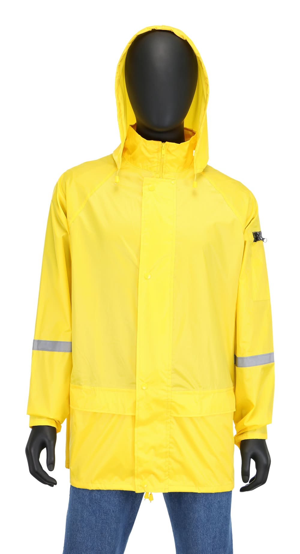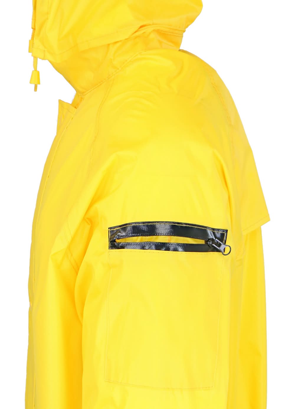 Hooded polyester rain jacket with waterproof zipper phone pocket on sleeve. Durable double-stitched seams for added strength and PVC lined for superior waterproof protection. Reflective tape on sleeves for increased visibility. Durable zipper front closure on coat with 5-snap storm flap with front closure to keep rain out. Attached hood with drawstring and zippered storage on collar. 2 Large front pockets for storage with hook and loop closure flaps. Waterproof jacket with hood. Color: Yellow