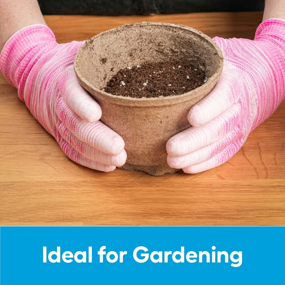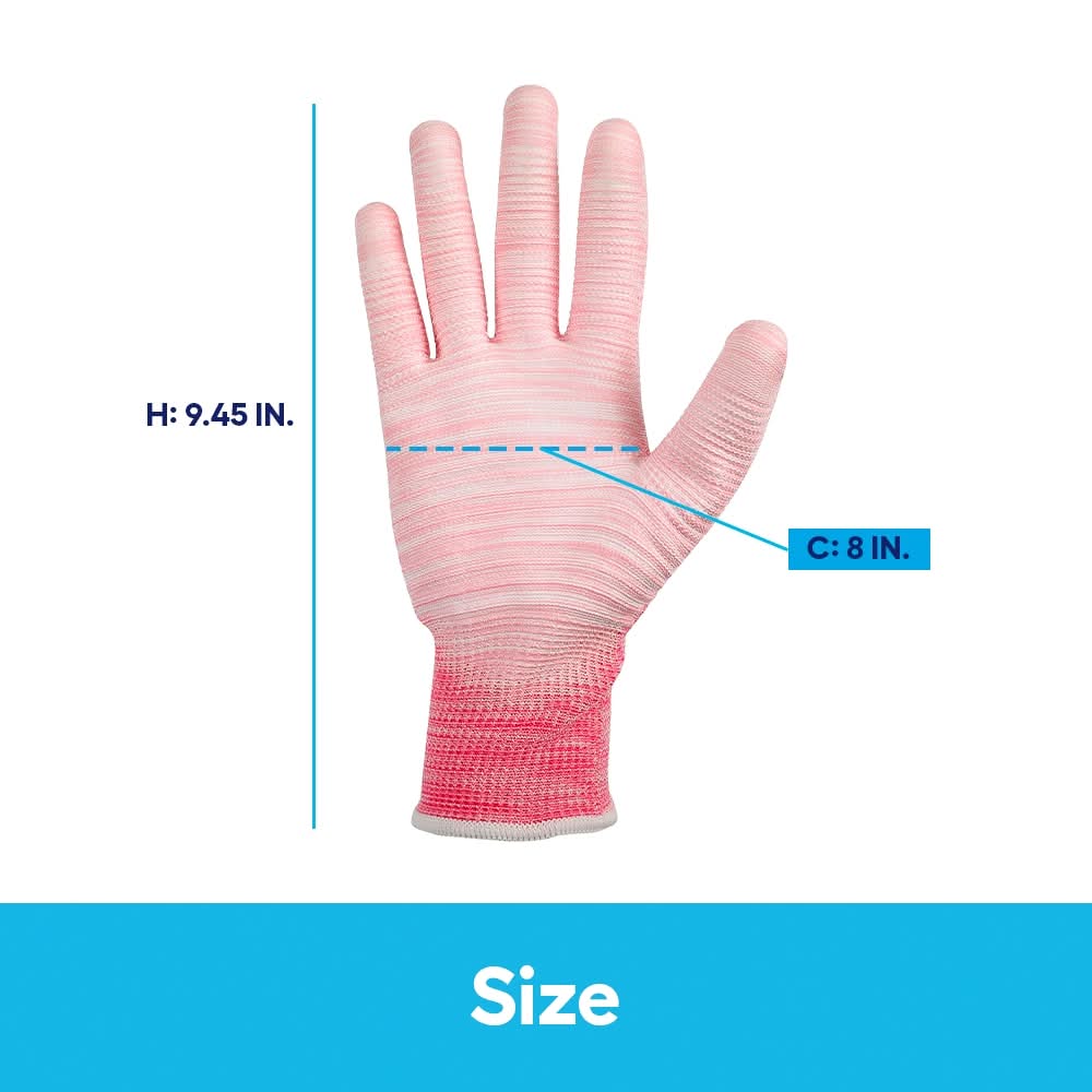 Polyurethane-dipped glove for use in wet and dry conditions. Environmentally friendly, made from 50% RPET bottles, GRS certified and OEKO-Tex. Special knitting process for ultimate gripping power. 15-Gauge knit polyester for dexterity and comfort. Lightweight and highly breathable. Strong abrasion resistance in a thin profile. Snug-fitting seamless knit wrist. Ergonomically formed to reduce hand fatigue. Size: Height - 9.45 in, Circumference - 8 in.. For CA Residents Only: WARNING: This product can expose you to chemicals including Lead which are known to the State of California to cause cancer and birth defects or other reproductive harm. For more information go to www.P65Warnings.ca.gov. Color: Pink