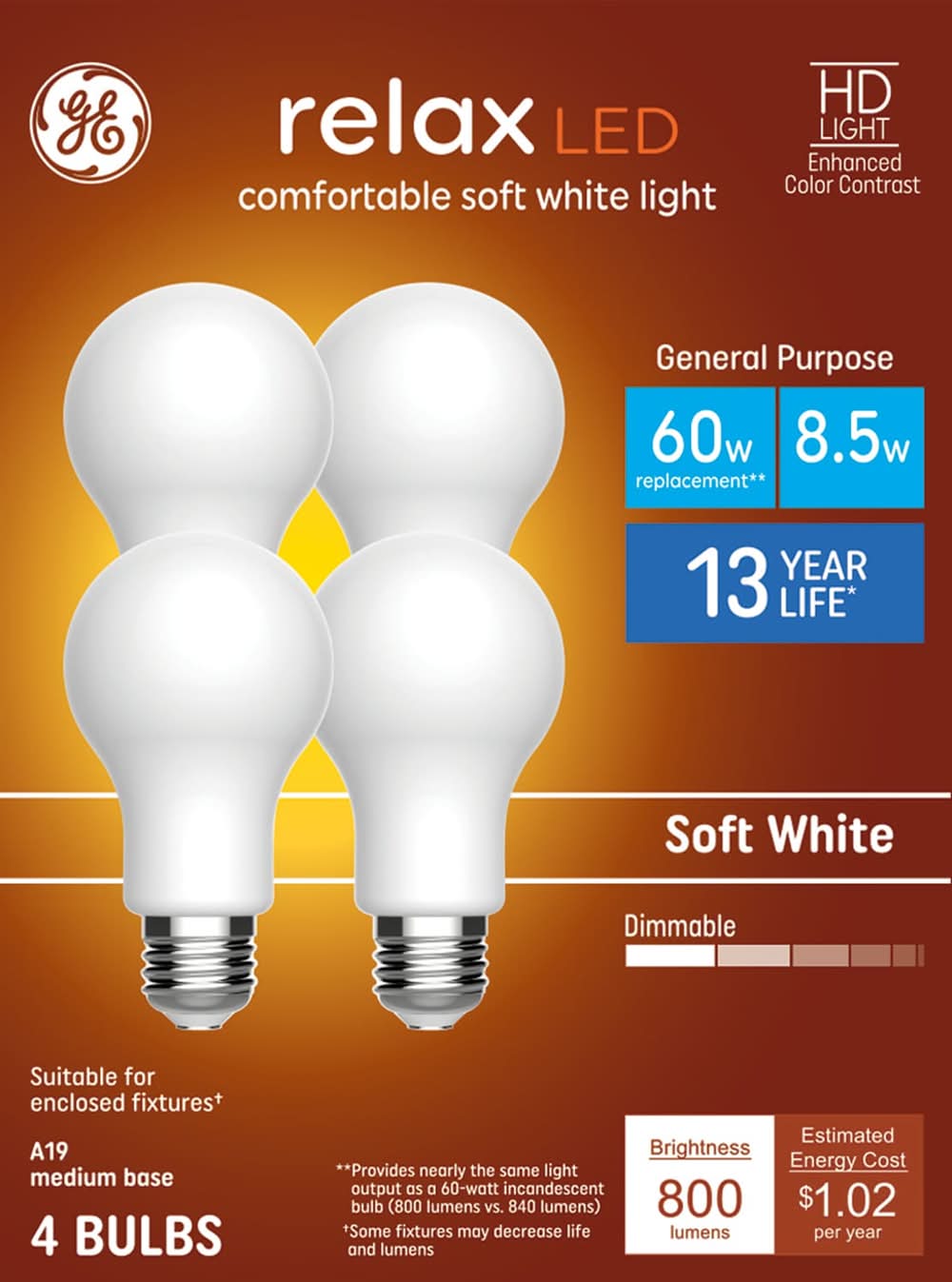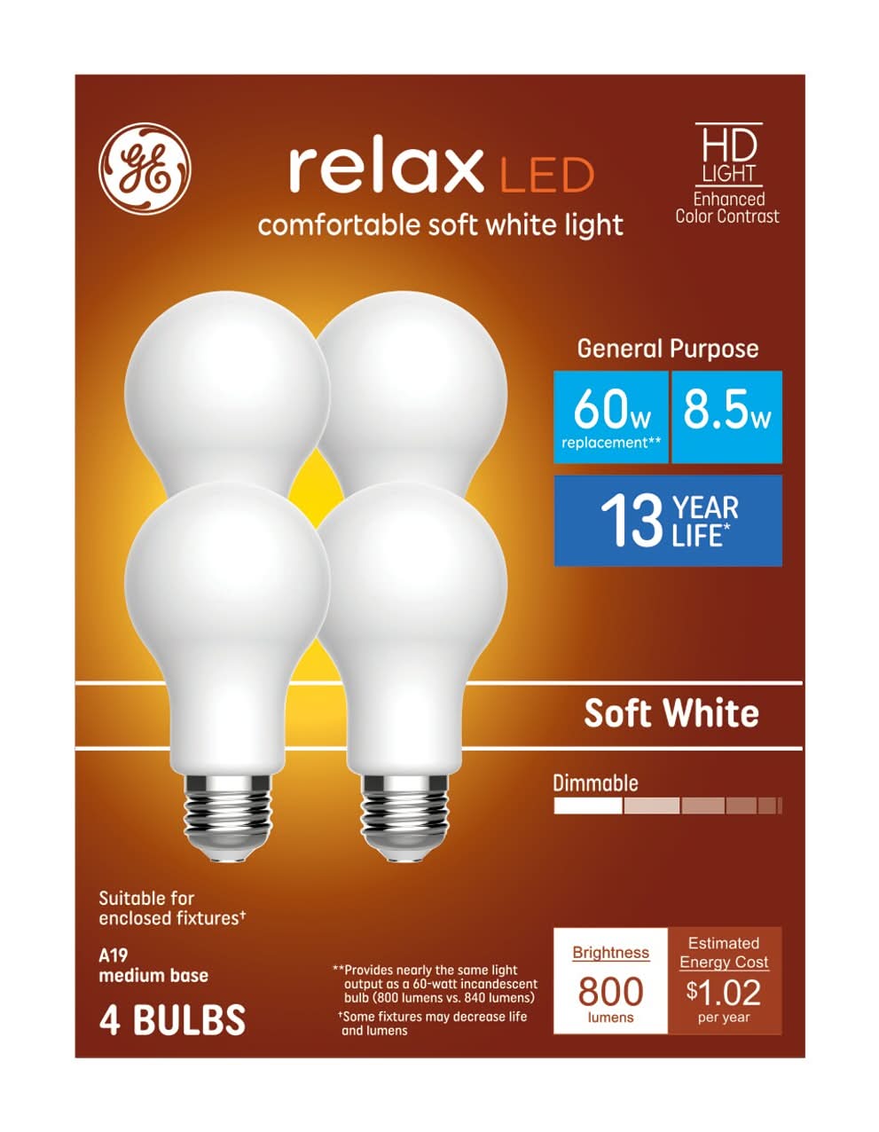 General Electric Relax 60 -Watt EQ A19 Soft white Medium base (E-26) Dimmable LED General purpose Light Bulb 4 -Pack