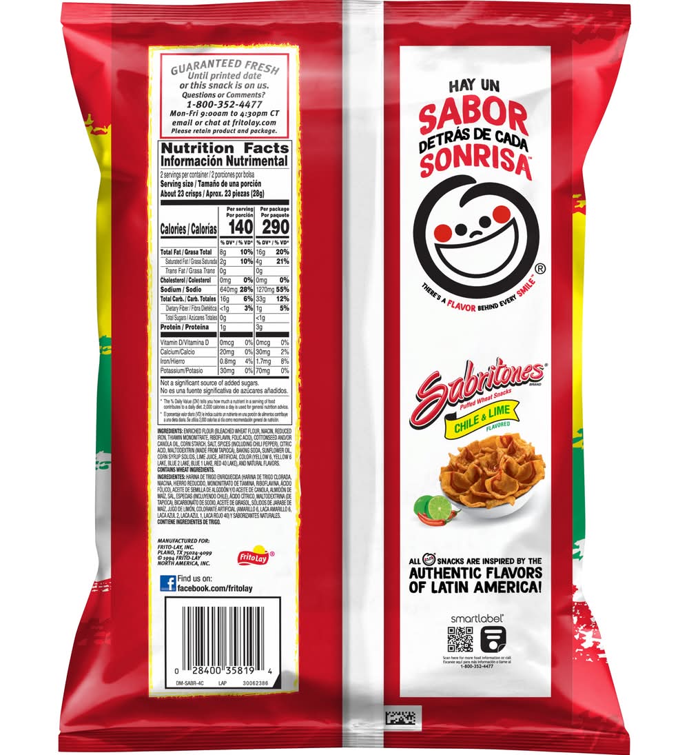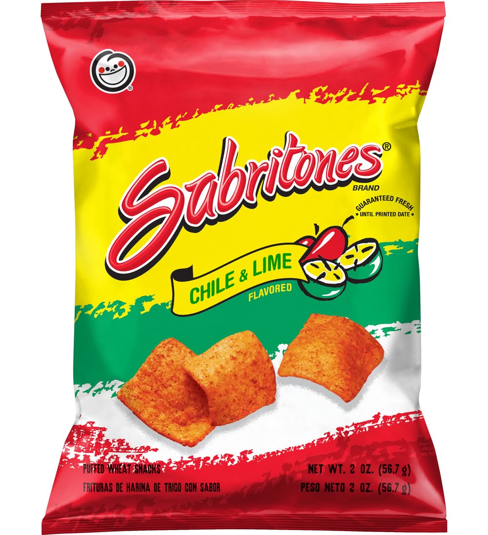 Sabritones Chile and lime flavored wheat puffs. Guarantee you will be satisfied with freshness and quality of this product. Great for Grab & Go Snacking.