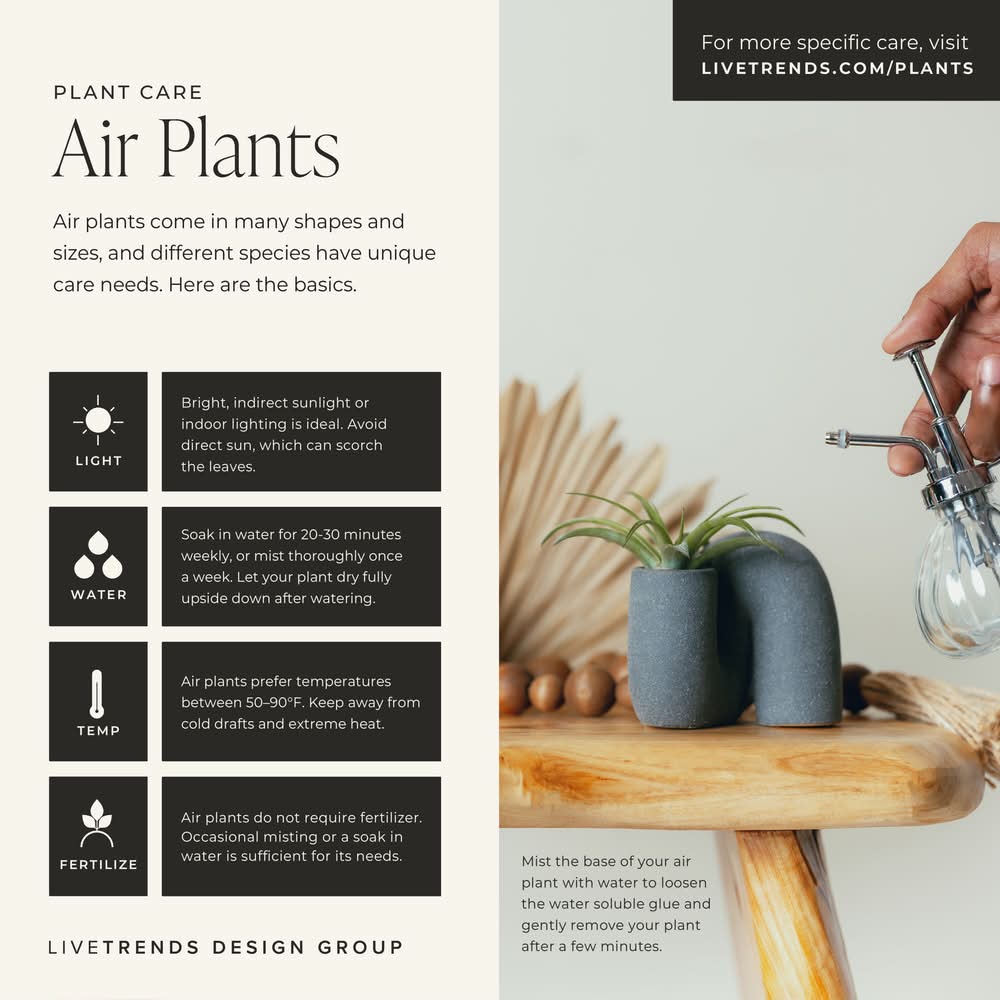 Assorted small tillandsia in specialty container. Display in medium light. Mist lightly with water once a week. Use Location: Indoor Light Requirements: Low light Blooming Season: Non-blooming Air Purifying: Yes Fragrant: No Insect Resistance: No Safer for Kids: No Safer for Pets: No