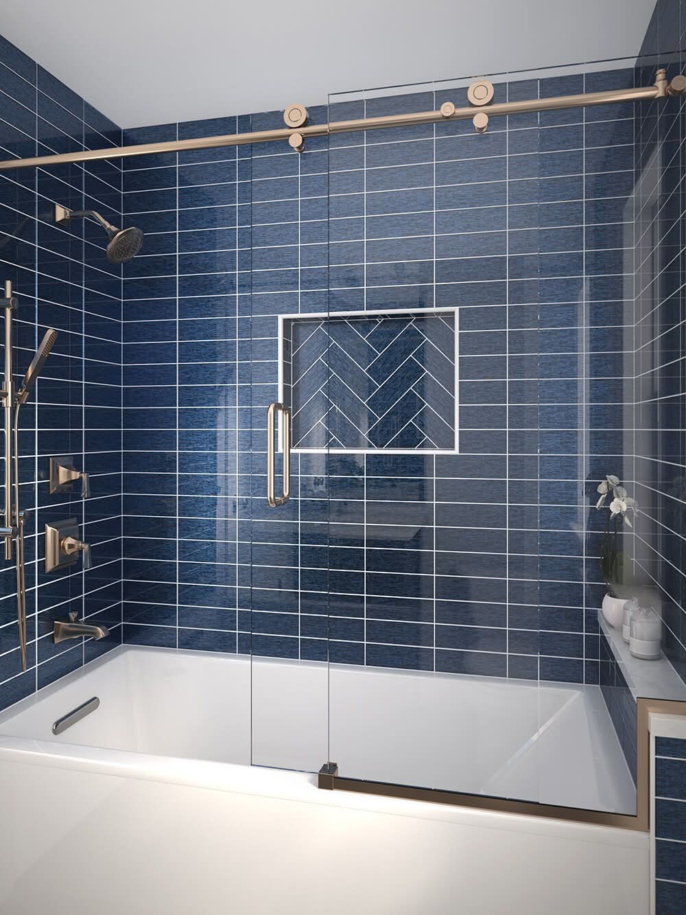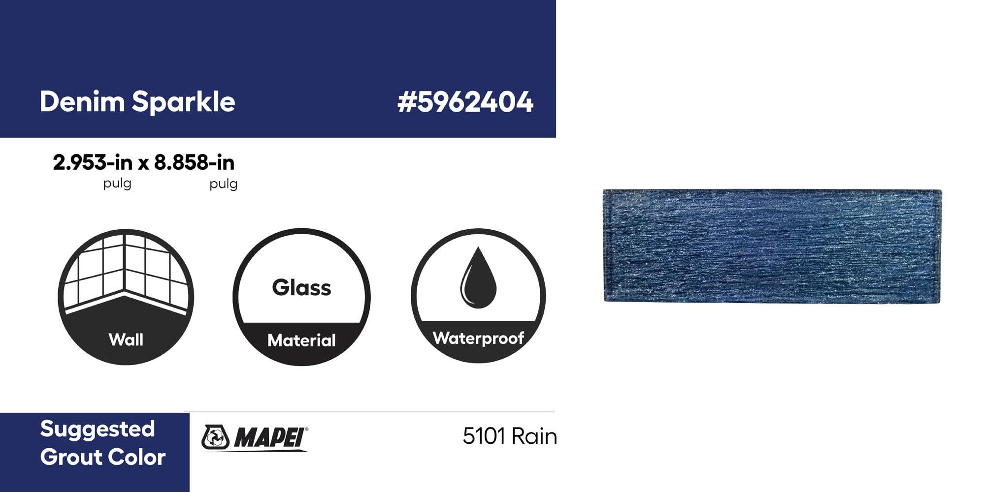 A sparkling shade of deep blue plus sparkles highlight the Denim Sparkle subway. Glittery glass with a textured linear feel shine in these 3-inch by 9-inch subway tiles. An elegant addition to many spaces including wet areas, backsplashes and a variety of walls, this glittery tile is an outstanding choice to update your space. From the Boutique Collection found only at Lowe's. Give your space an instant coolness with these sparkling pieces. Indoor walls, including shower walls, glisten and shine with these blue wall tile beauties. Recommended use of un-sanded grout. When used on shower walls, tile must be grouted with water resistant or epoxy grout. Design your dream space with this marvelous blue sparkling gem. Use Location: Indoor For CA Residents Only: WARNING: This product can expose you to chemicals including Lead which are known to the State of California to cause cancer and birth defects or other reproductive harm. For more information go to www.P65Warnings.ca.gov.