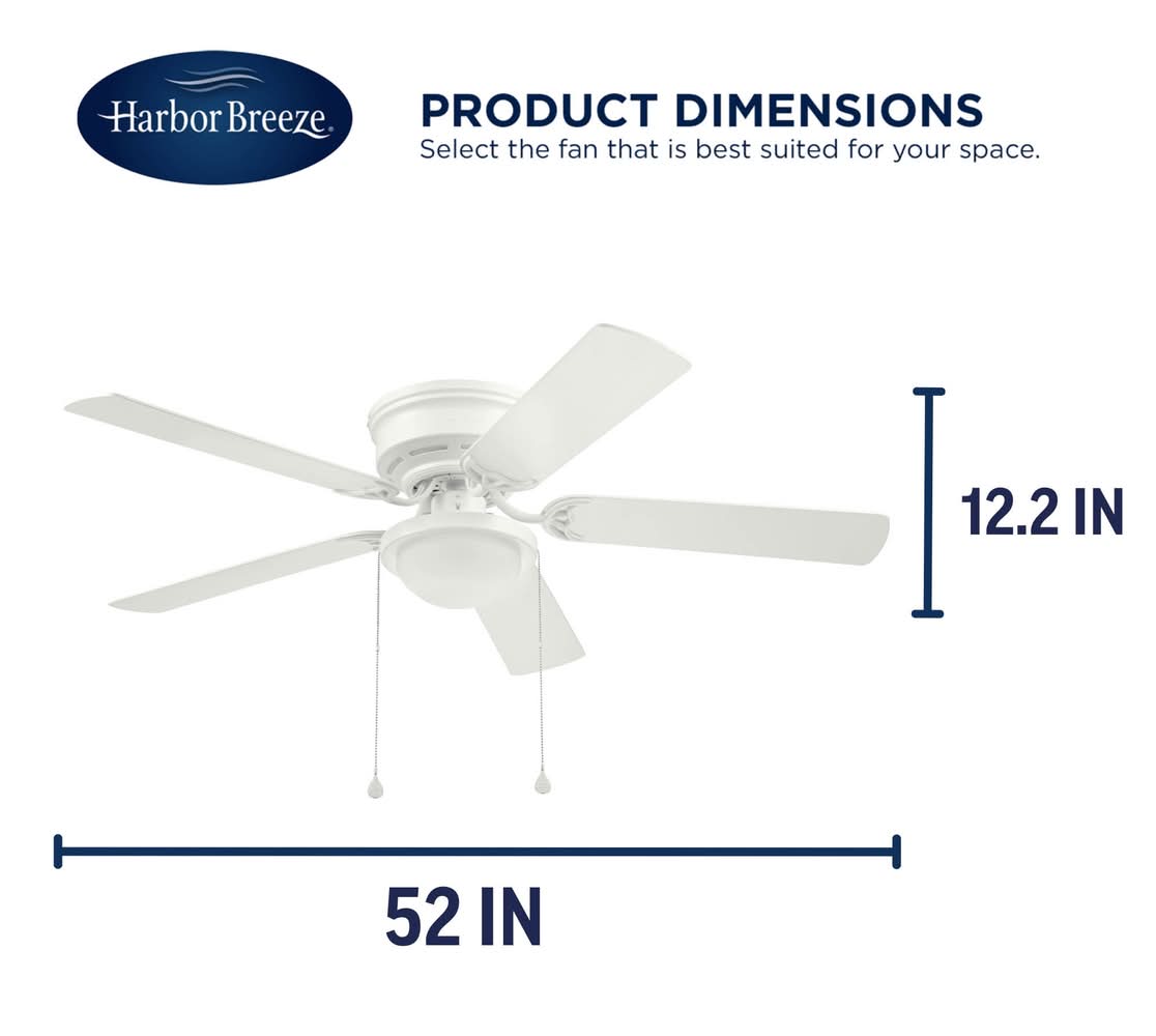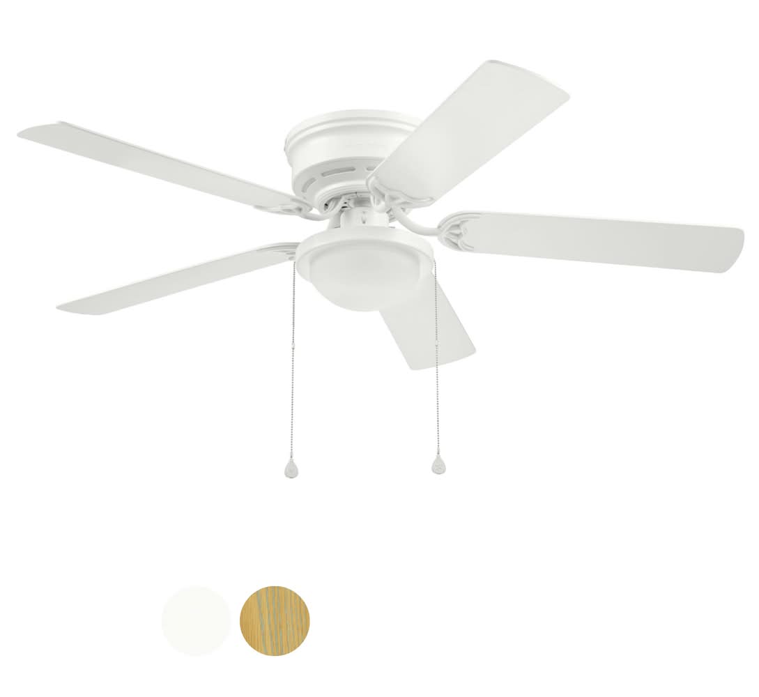 Low profile design to be mounted flush with the ceiling where more walk-through space is needed. Easy-to-use pull chains are included for quick adjustments to the 3 speed settings and on/off light control. Frosted glass globe houses dimmable A15, E26 6.5w, 600 lumen LED bulb (included). White finish complements the 5 reversible white or washed oak ceiling fan blades. 52-in fan provides airflow ideal for medium to large sized rooms up to 400-sq ft. Reversible motor efficiently circulates cool air in the summer and warm air in the winter, cutting down on energy costs. Classic design transcends many styles of decor. Limited lifetime warranty. Use Location: Indoor For CA Residents Only: WARNING: This product can expose you to chemicals including Lead which are known to the State of California to cause cancer and birth defects or other reproductive harm. For more information go to www.P65Warnings.ca.gov. Color: No