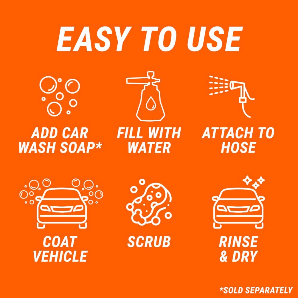 Exclusive, innovative technology. For use with a pressure washer or standard garden hose. Produces premium car wash results for everyone. Provides thick and uniform foam coverage, making cleaning easy and enjoyable. Helps remove dirt and grime from all of your car’s exterior surfaces. Works with both gas or electric pressure washers (500-3,500 PSI). 40oz - 1.18L reservoir so you can easily clean larger cars, trucks and SUVs. Design makes it easy to use and ensures it won’t tip over. Compatible with 1/4 Inch Quick Connect.