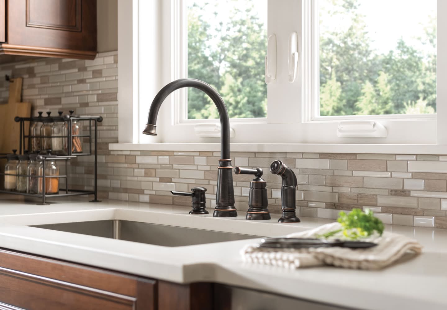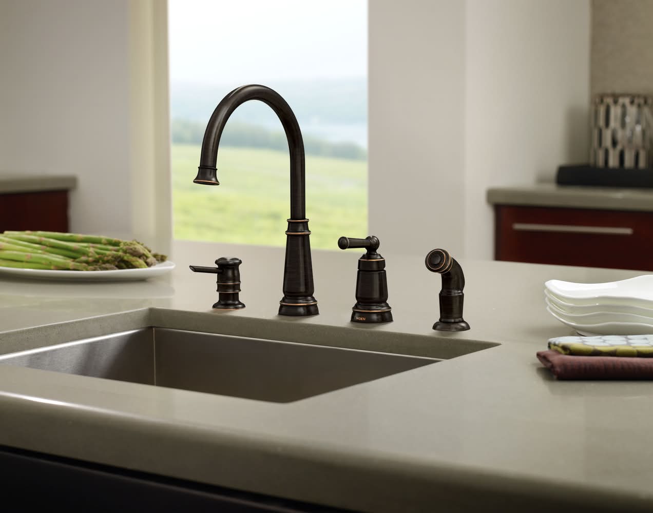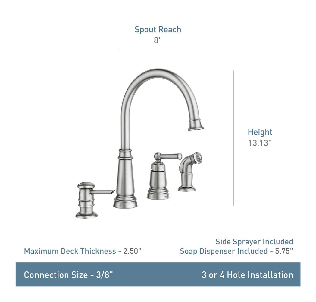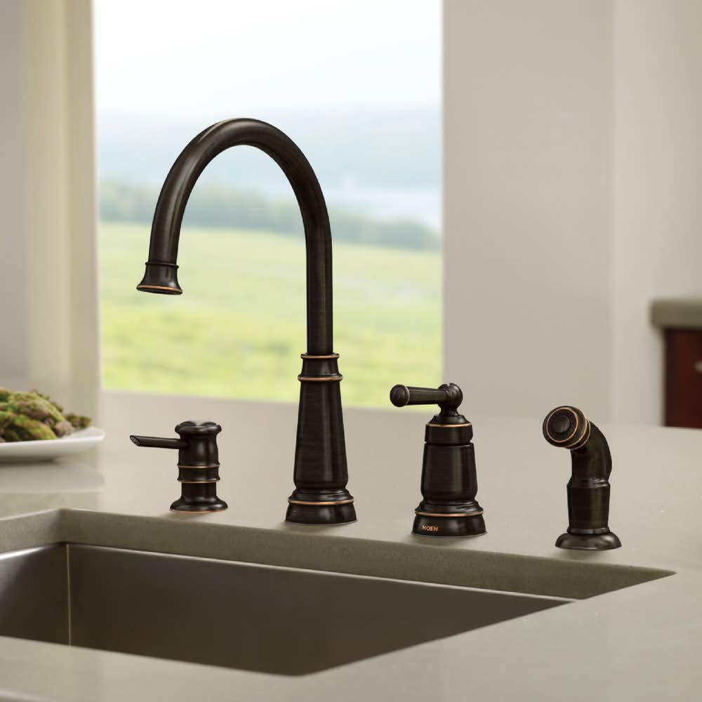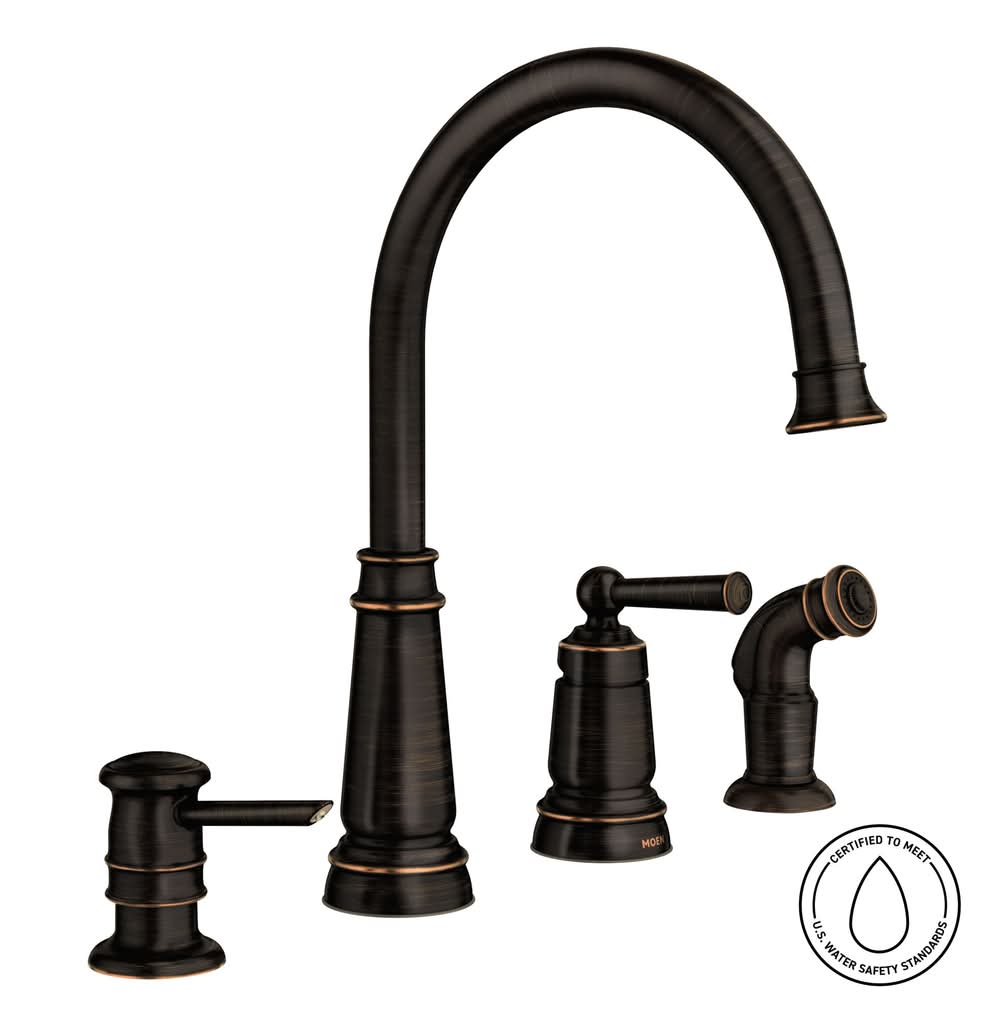 NATURAL HIGHLIGHTS: Mediterranean Bronze finish delivers a rich, dark brown, Old World finish with striking light and dark accents. EASY TO USE: Single handle makes it easy to adjust the water temperature and pressure. SIDE SPRAY: Includes side spray hose for convenient, flexible cleaning at the sink. EVERYDAY CONVENIENCE: Aerated flow is ideal for everyday bathroom tasks, like brushing teeth and washing hands. MULTIPLE USE: Use dispenser for either soap or lotion. BUILT TO LAST: Backed by Moen’s Limited Lifetime Warranty. TRUSTED PERFORMANCE: Tested beyond industry standards to handle real-world wear and tear—so your faucet performs like new for decades. EVERY DROP, CERTIFIED SAFE: Every Moen residential kitchen and bath faucet complies with the Federal Safe Drinking Water Act and NSF 61 standards — making Moen the safe choice for clean drinking water. Available in two distinctive finishes.