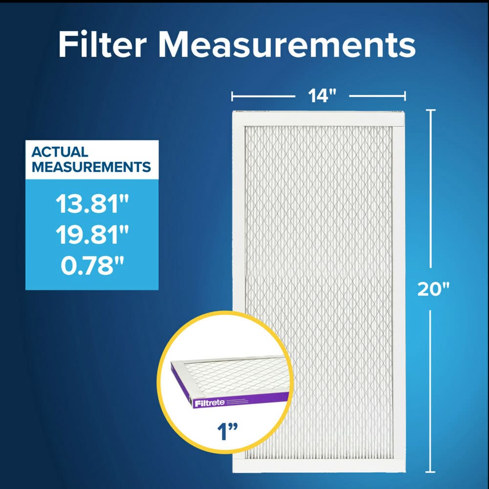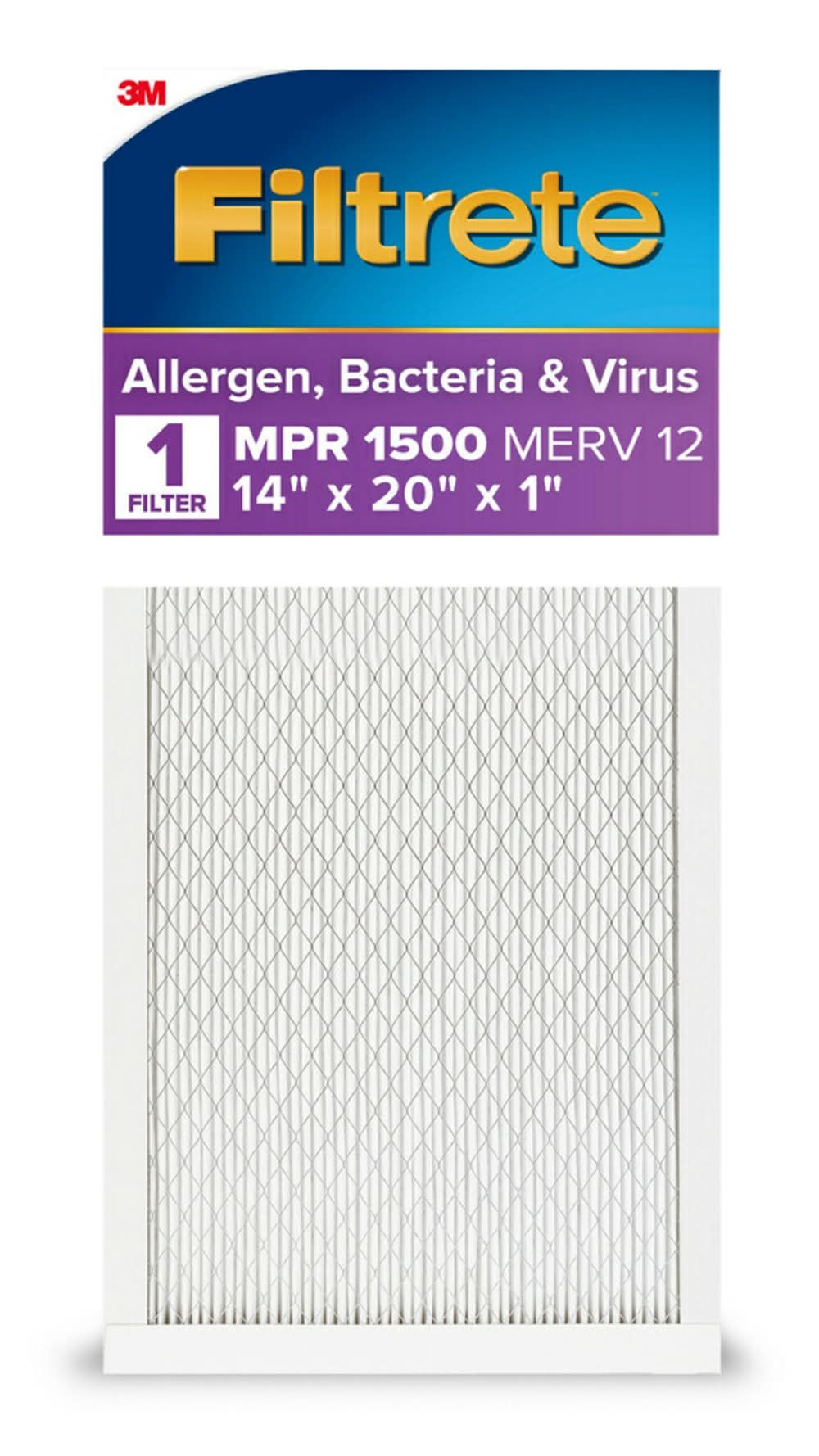 Includes a 1-pack of 3-month pleated 1-in Filtrete 14x20x1 MPR 1500 AC Furnace Air Filter helps capture unwanted particles. Designed with exclusive Filtrete 3-in-1 technology to pull in and trap unwanted particles, allowing cleaner air to flow through. With a 1500 MPR and MERV 12 rating, your Filtrete Filter will help capture many microparticles from the air passing through it. This furnace filter is CERTIFIED asthma and allergy-friendly (2) and helps capture dust, lint and other allergens in your household air. Versatile Uses: Works for changing the air filters in your furnace, air conditioner/heating system or HVAC system. Change your filter often: For optimal performance, make sure to change your filter at least once every 90 days. Smart App: Use the Filtrete Smart App (iOS or Android) to set 30-, 60- or 90-day reminders to change your air filter. This air filter captures up to 54% of small particles (2), like bacteria and particles that carry viruses, to help make your air cleaner.