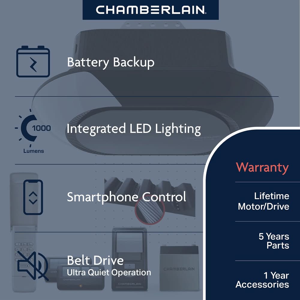 Chamberlain 3/4 HPS myQ Smart Compatible Belt drive Garage Door Opener Wi-Fi Compatibility and Battery Back-Up LED Light