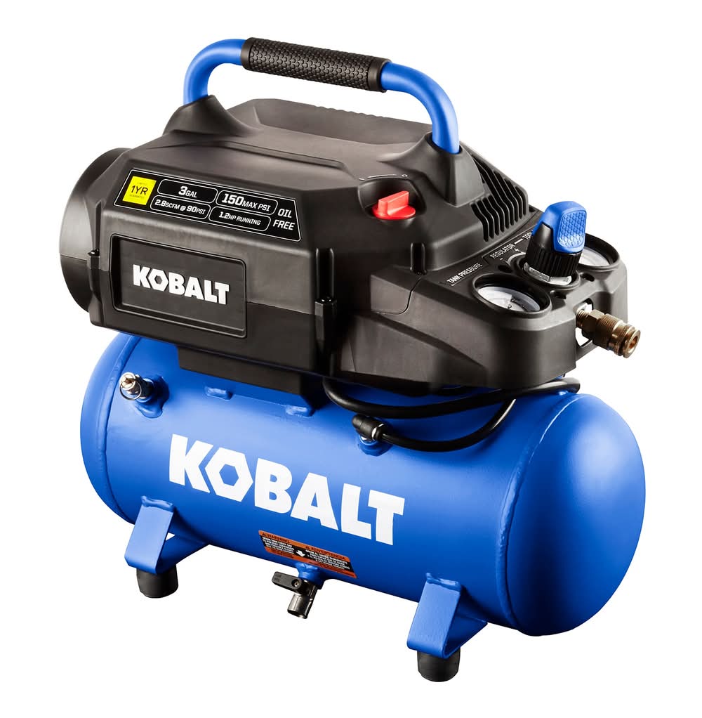 KOBALT 3 gal, lightweight, balanced design improves portability between work sites. 150 Max PSI allows more usable air storage for fast inflation and longer tool run time. Class leading air delivery exceeds requirements for all 15 – 23 gauge nail guns, and other popular small body air tools. Oil-free compressor pump is maintenance-free and starts easily in sub-zero temperatures. Noise filtration reduces noise to only 78 dba. Ball-valve tank drain requires only 1/4 turn for easy tank draining. No-mar rubberized feet. 1-year warranty. For CA Residents Only: WARNING: This product can expose you to chemicals including Lead which are known to the State of California to cause cancer and birth defects or other reproductive harm. For more information go to www.P65Warnings.ca.gov.