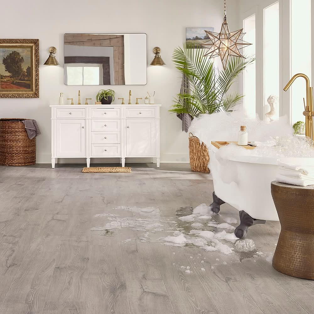 Falls Trail Oak hybrid resilient floor offers silver accents, realistic wirebrushed texture and authentic oak characteristics for a sophisticated look . Made from 70% total recycled content with an 80% renewable, organic core — and it’s PVC-free. Lowe's Project Source mouldings for Falls Trail oak are - Doorway Kit-5979517, Qtr Rnd-5979537, Flush Stairnose-5979527, Multi-purpose-5994101. Engineered to withstand playful paws backed by our Lifetime Pet Scratch Warranty, and guaranteed not to wear, fade or stain with ultimate dent protection for superior durability. PERGO® EverCraft™ NatureHD™ Technology recreates the authentic hardwood look you desire with natural colors, textures, and wood characteristics. Pergo floors with WetProtect® technology have a lifetime waterproof surface and subfloor warranty making them perfect for high-moisture areas like kitchens, baths, laundry rooms, or mudrooms. CleanProtect® technology provides antimicrobial properties built in to protect For CA Residents Only: WARNING: This product can expose you to chemicals including Lead which are known to the State of California to cause cancer and birth defects or other reproductive harm. For more information go to www.P65Warnings.ca.gov. Color: Gray