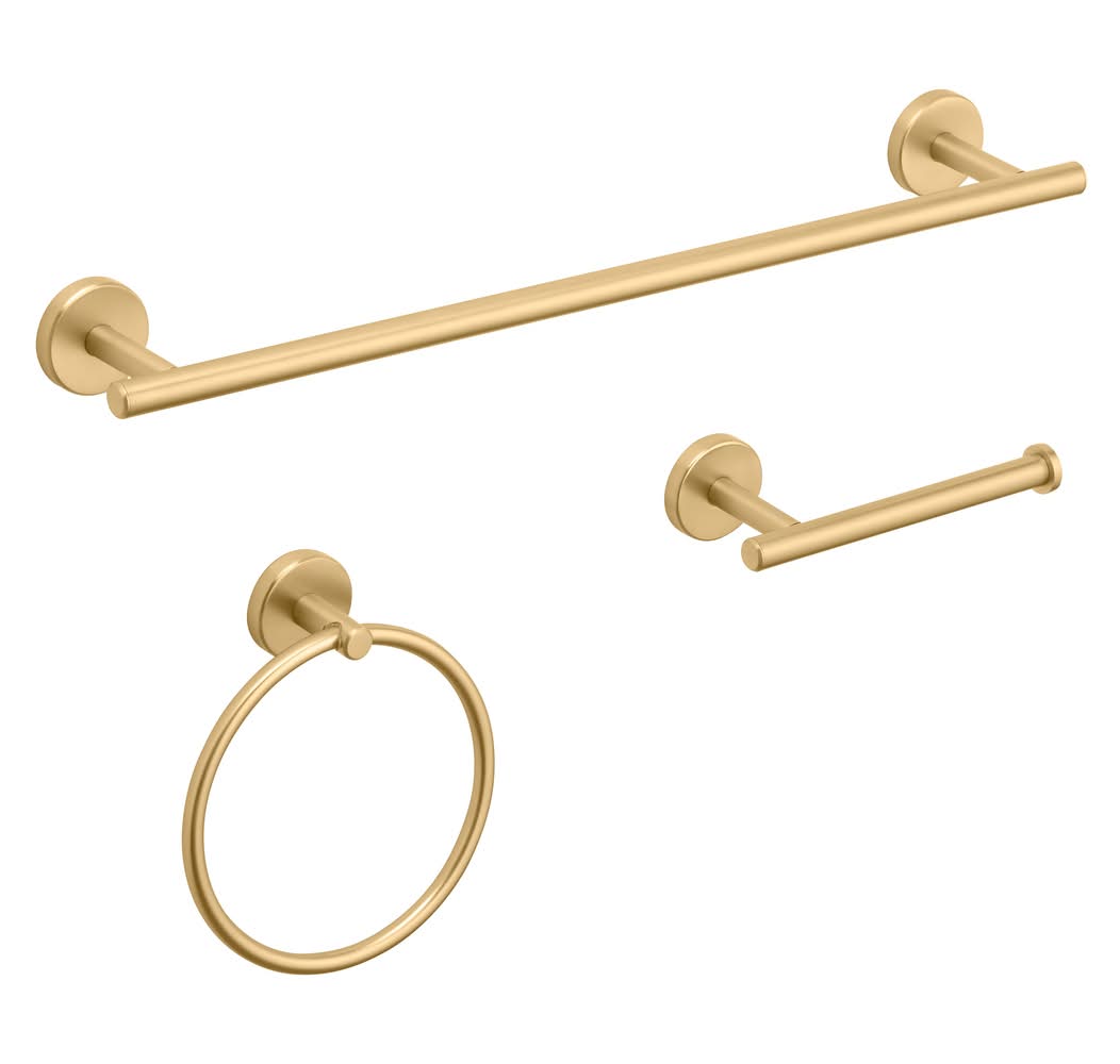 Allen and Roth 3 piece bathroom hardware set from the Harlow collection. Kit contains an 18 inch towel bar, toilet paper holder, and towel ring. Mounting hardware included for easy installation. Concealed mounting for a finished look. Assembly instructions included to make installation quick and simple. Brushed gold finish provides a traditional feel. Available in multiple finishes. Complete your project with the matching Harlow bath collection items. Limited lifetime warranty for peace of mind. For CA Residents Only: WARNING: This product can expose you to chemicals including Lead which are known to the State of California to cause cancer and birth defects or other reproductive harm. For more information go to www.P65Warnings.ca.gov.