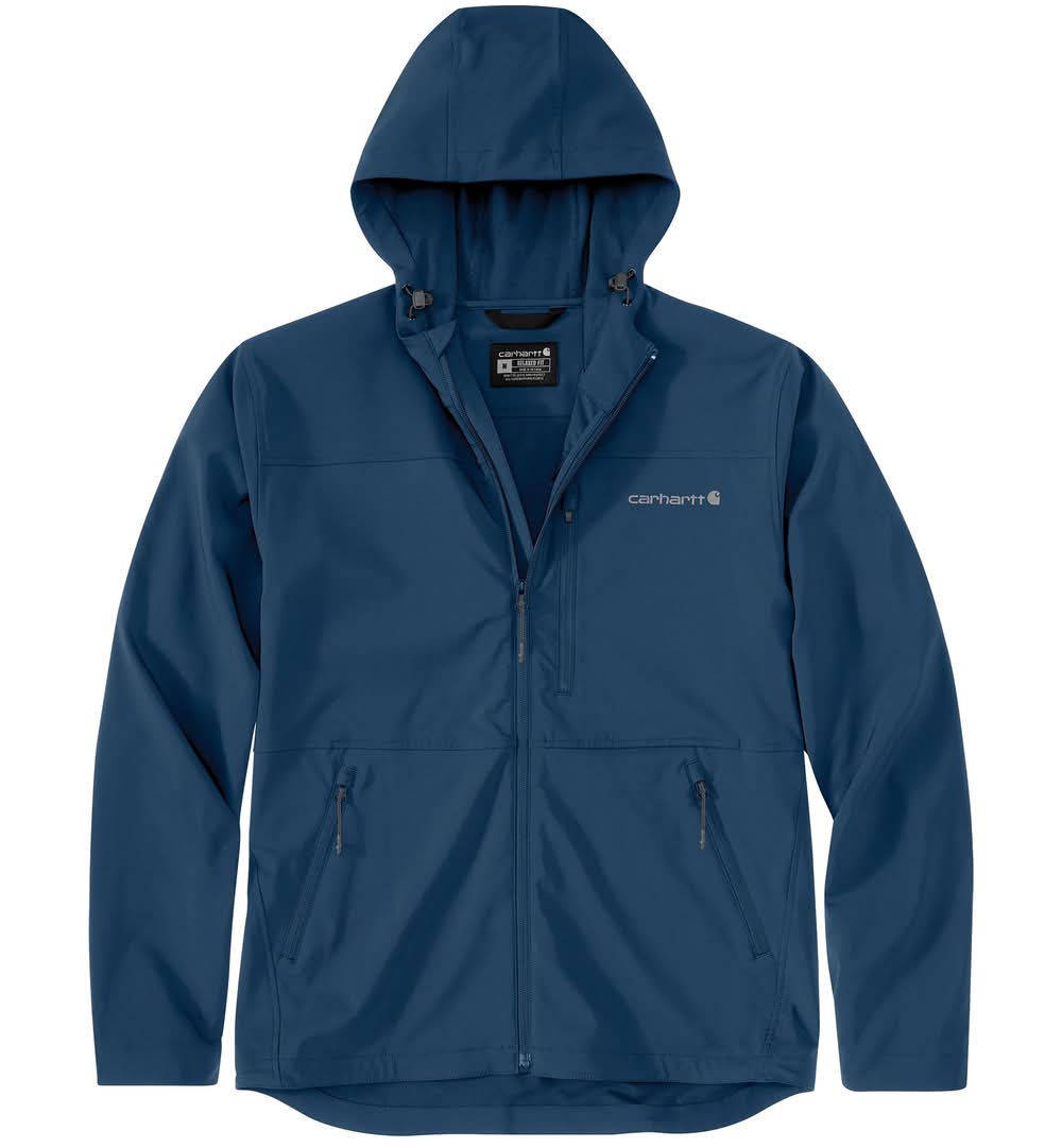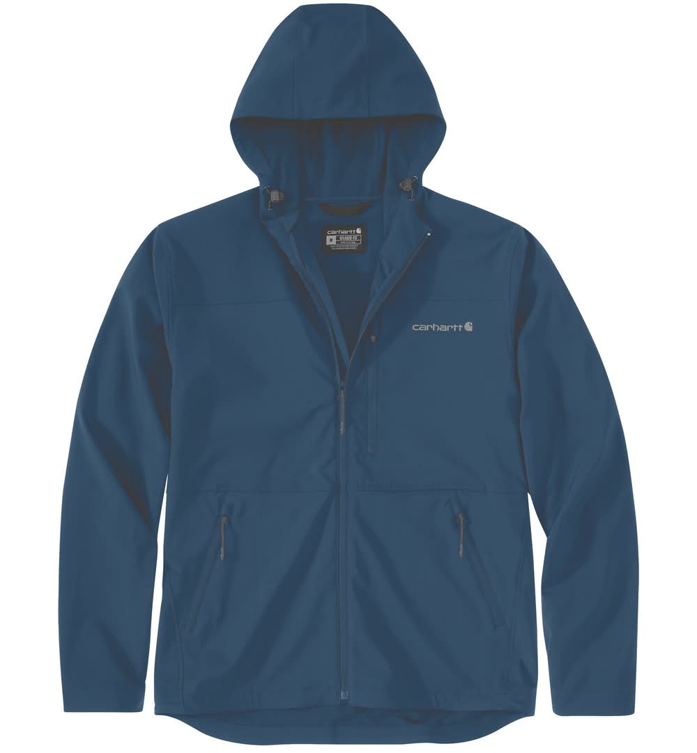 5.6-ounce, 90% polyester / 10% spandex stretch dobby. Built to move with Rugged Flex® stretch technology. Rain Defender® durable water repellent (DWR). Wind Fighter® technology tames the wind. Built with Carhartt Force® technology to wick sweat, dry fast, and fight odors. Force Sun Defender™ UPF 50+ UV Protection. Attached hood with adjustable hood hem. Hook-and-loop adjustable cuffs. Drawcord-adjustable droptail hem. • Color: Blue • male