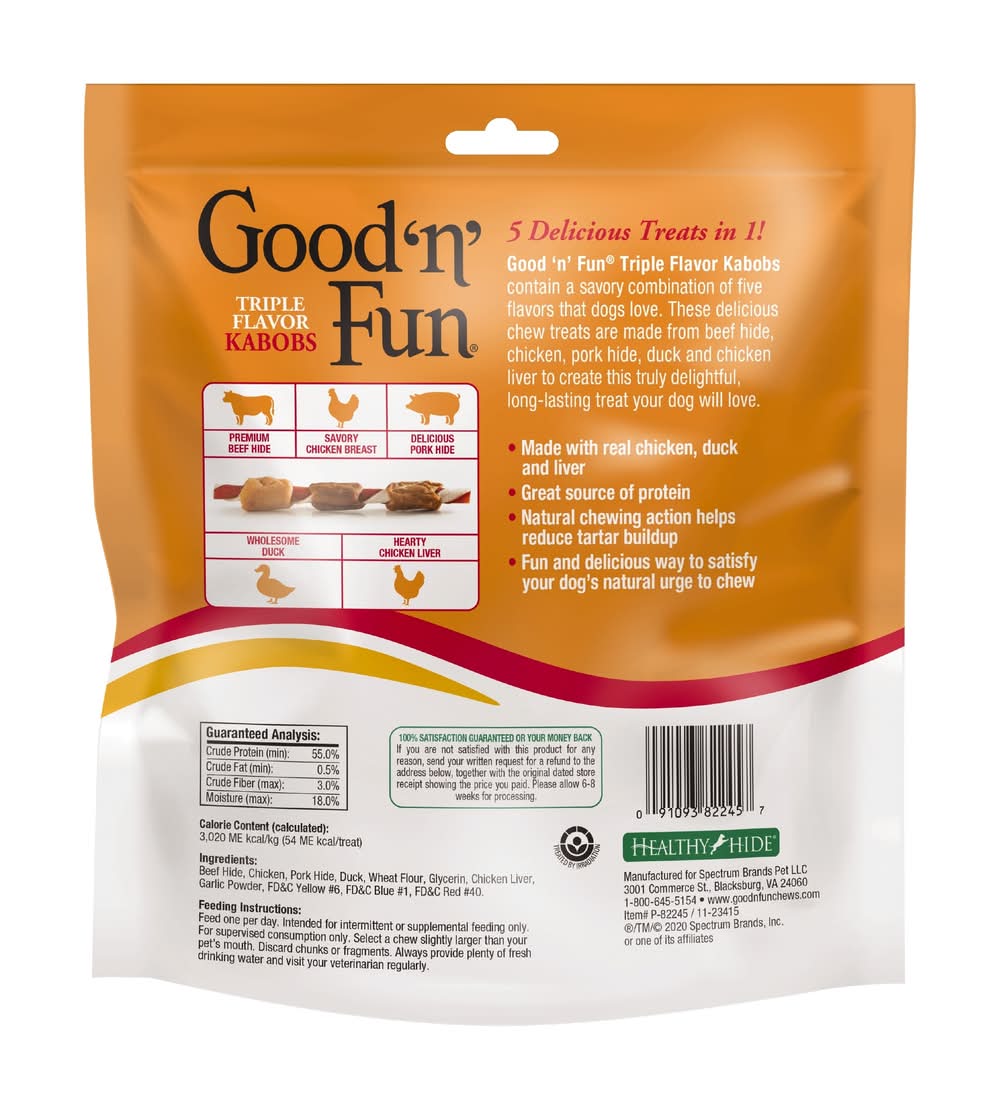 FLAVORS DOGS LOVE: Made from pork hide and rawhide, then wrapped with real, savory chicken, wholesome duck and hearty chicken liver flavor. LONG-LASTING: Good ‘n’ Fun Triple Flavor Kabobs are truly delightful, long-lasting rawhide treats your dog will love. GOOD SOURCE OF PROTEIN: Perfect to give your dog every day for a chew full of fun and flavor. KABOB SHAPE: Wrapped with premium cuts of real chicken canines crave. HELPS MAINTAIN HEALTHY TEETH: Chewing helps promote healthy teeth and gums. Use Location: Indoor/Outdoor Color: Brown