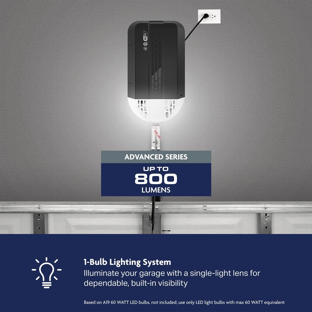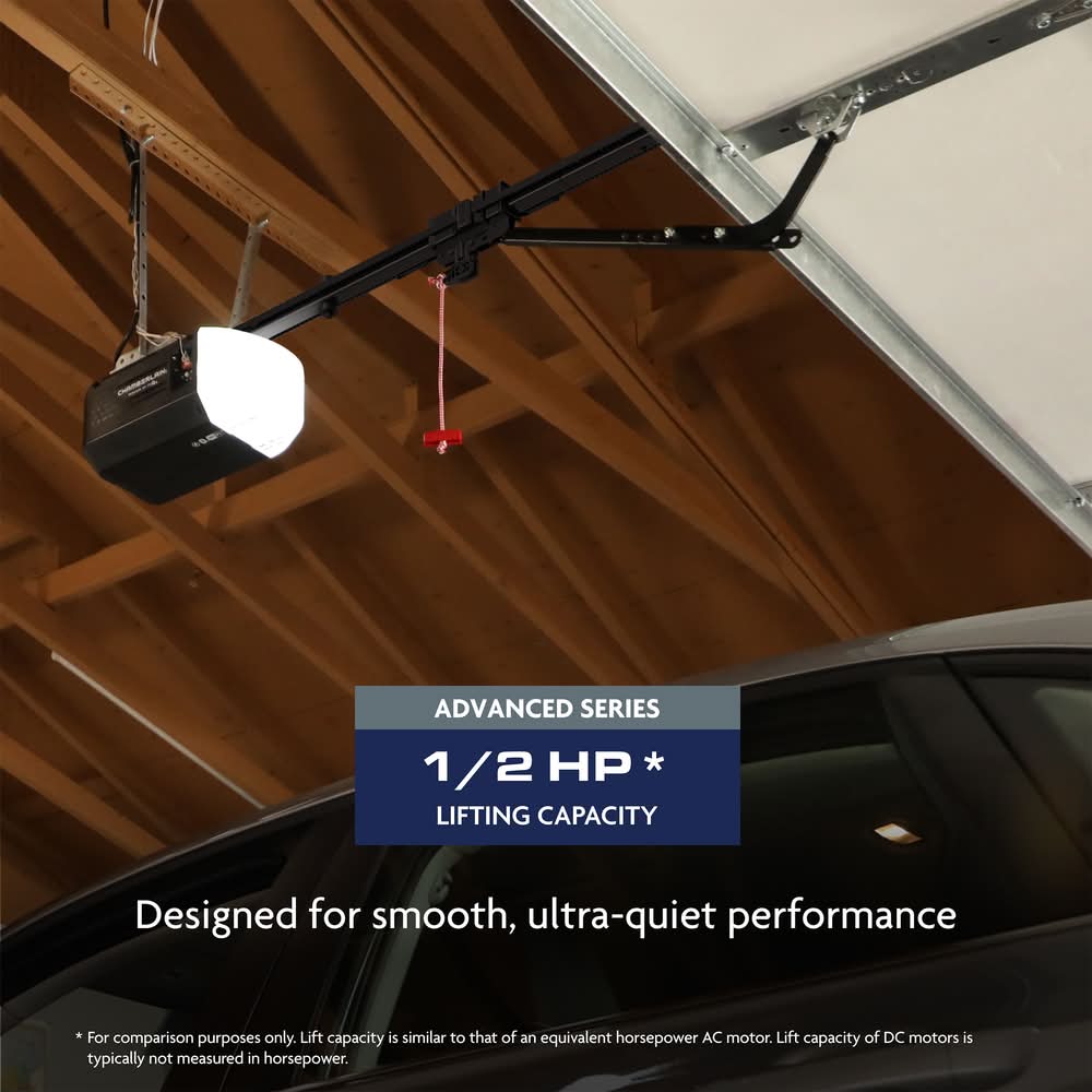 Power Outage Protection: Ensure uninterrupted access during power failures, battery backup keeps you in control when it matters most, for safety and peace of mind.. Ultra-Quiet Operation: With a reinforced belt drive and ultra-quiet DC motor—ideal for garages near living spaces or bedrooms.. Smartphone Control: Control your garage from anywhere with Wi-Fi connectivity and the myQ app—bringing convenience and peace of mind every day.. Reliable Power for Everyday Use: Choose the right horsepower for the job; Our 1/2 HP motor* delivers smooth, consistent strength for everyday reliability and standard garage doors; *For comparison purposes only; lift capacity similar to 1/2 horsepower AC motor, Lift capacity of DC motors is typically not measured in horsepower... Bright When You Need It Most- Illuminate your garage with 1 Bulb lighting for dependable visibility—ideal for everyday lighting needs at any hour; bulb sold separately.. Built to Last — Backed with Confidence: Protected by For CA Residents Only: WARNING: This product can expose you to chemicals including Lead which are known to the State of California to cause cancer and birth defects or other reproductive harm. For more information go to www.P65Warnings.ca.gov. Color: Black