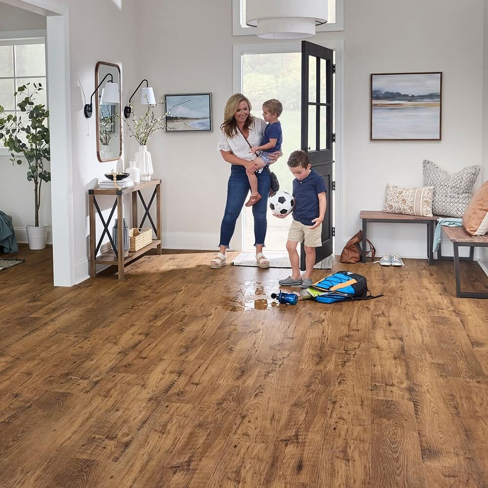 STAINMASTER Pet Protect Waterproof Laminate Flooring is durable, stain- resistant, and easy to clean-ideal for living areas, kitchens, hallways, & more. CLAWSHIELD™ resists pet scratches and ACTIVELIFE SHIELD™ provides dent and abrasion resistance, and makes floors easy to clean. Waterproof surface coating is 2X more impact resistant and wear resistant than standard residential grade laminate with an AC4 rated wear layer. Beckett Ridge Chestnut is a wood-based laminate floor with warm amber tones, a pressed bevel edge and an enhanced wood grain texture that brings a rich, classic look to your space. Pre-attached 2mm acoustic padding underlayment offers sound absorption and reduces installation time and cost. DIY-friendly locking system tightly interlocks planks, forming a seamless surface & allowing for easy installation. 12mm total thickness (10 mm plank + 2mm attached pad); 7.48-in W x 47.24-in L planks cover 22.09-sq ft per carton; 9 planks per carton. Backed by a Lifetime Stain For CA Residents Only: WARNING: This product can expose you to chemicals including Lead which are known to the State of California to cause cancer and birth defects or other reproductive harm. For more information go to www.P65Warnings.ca.gov. Color: Brown