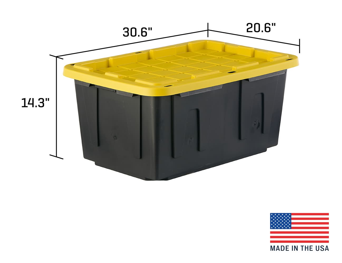 Heavy Duty: the thick plastic walls of the Project Source Commander 27G storage tote keeps the valuables inside safe. Stackable: securely stack multiple Project Source Commander storage totes without fear of tipping while optimizing vertical storage space. Lockable: 6 holes around the outer rim of the lid enable the use of zip-ties and padlocks to keep your items safe. Tie down grooves for safe transport. Lightweight and comfortable to carry. Full storage solution when paired with the Project Source Commander shelves. Dimensions: 14.3" x 20.6" x 30.6". Made from 45% recycled content. Made in the USA. Use Location: Indoor Color: Black
