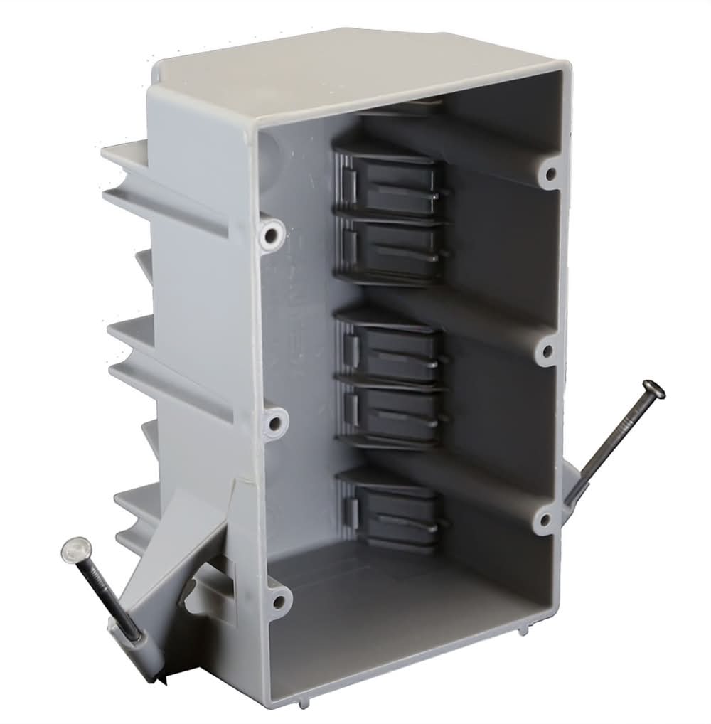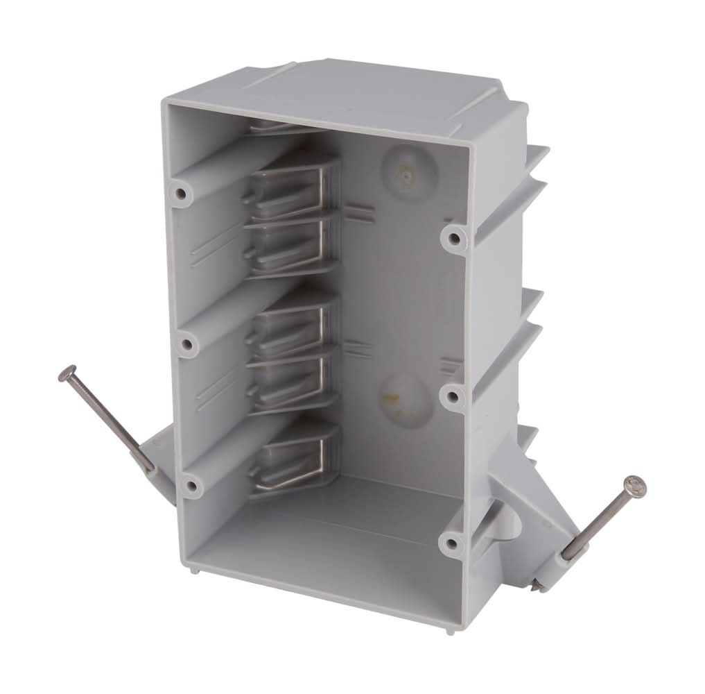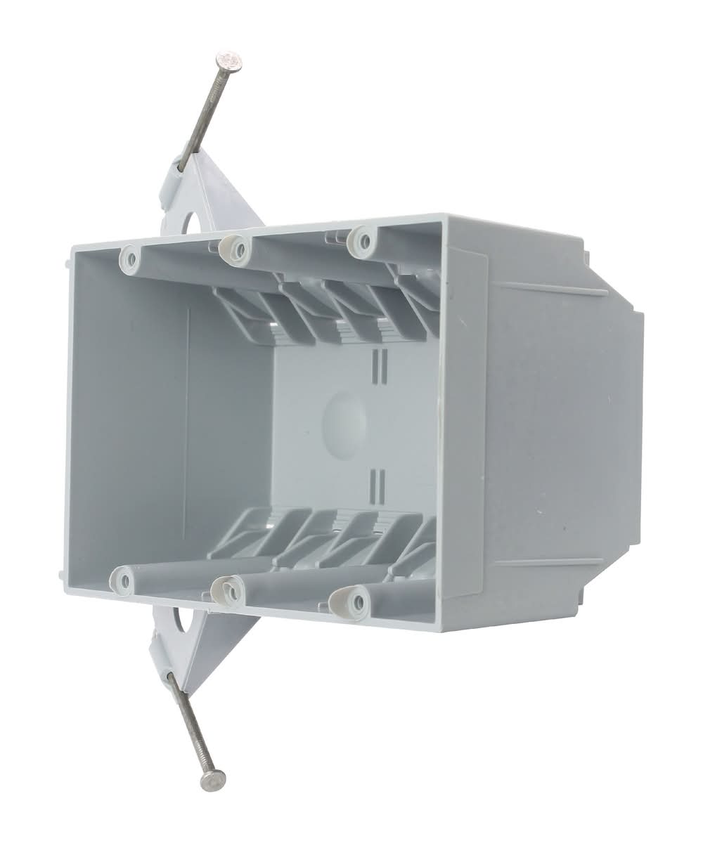 Enhanced angled nails for quick mounting between studs. Attached nails for mounting included. 12 integral wire clamps to hold wires securely. Engineered for easy, cost saving installation and constructed with resilient PVC for durability. Use Location: Wall Color: Gray