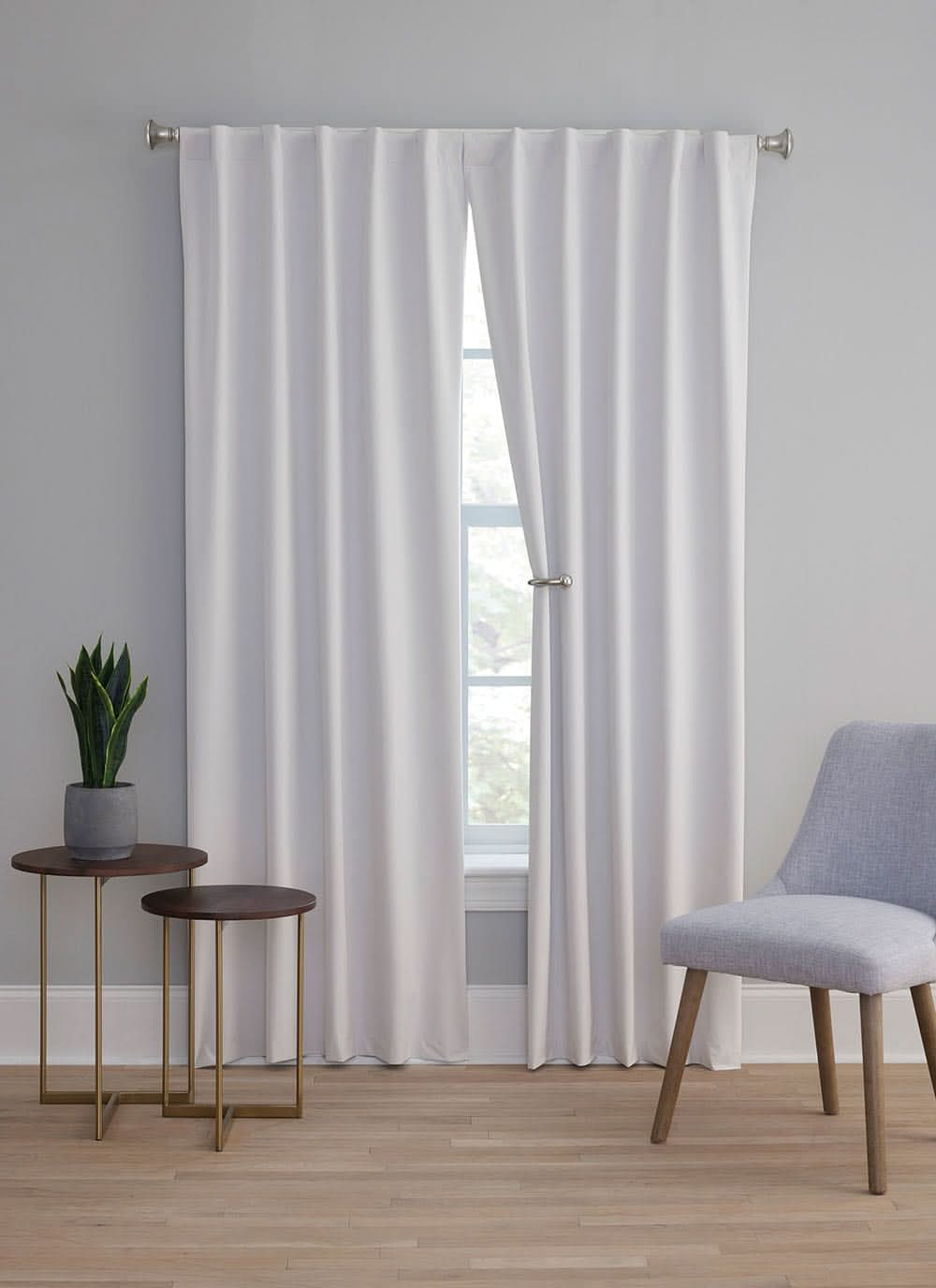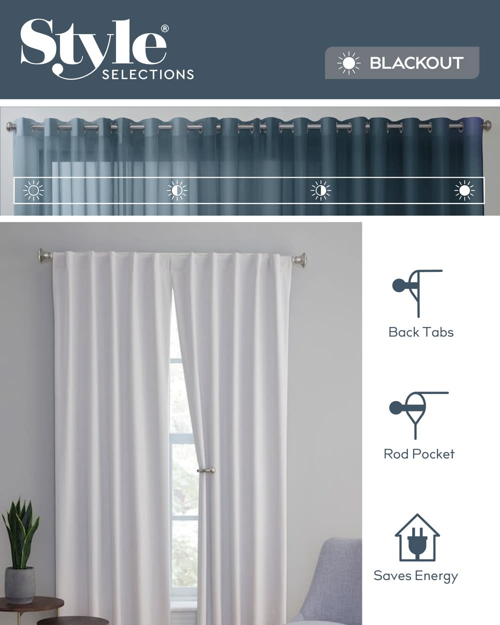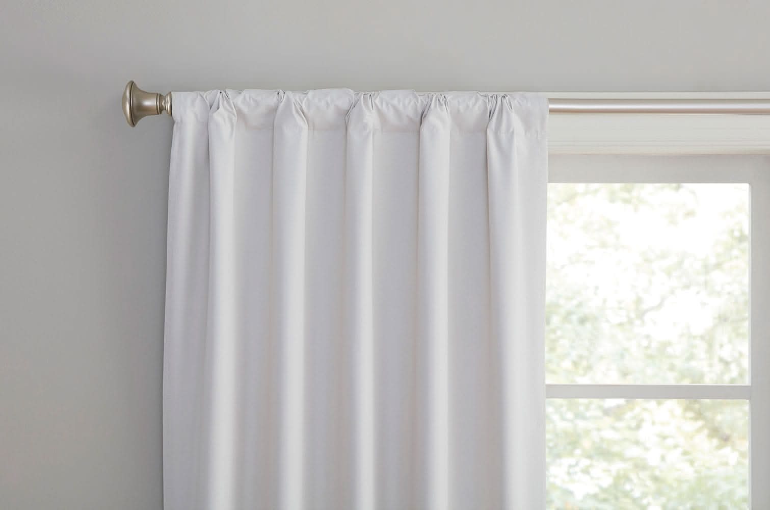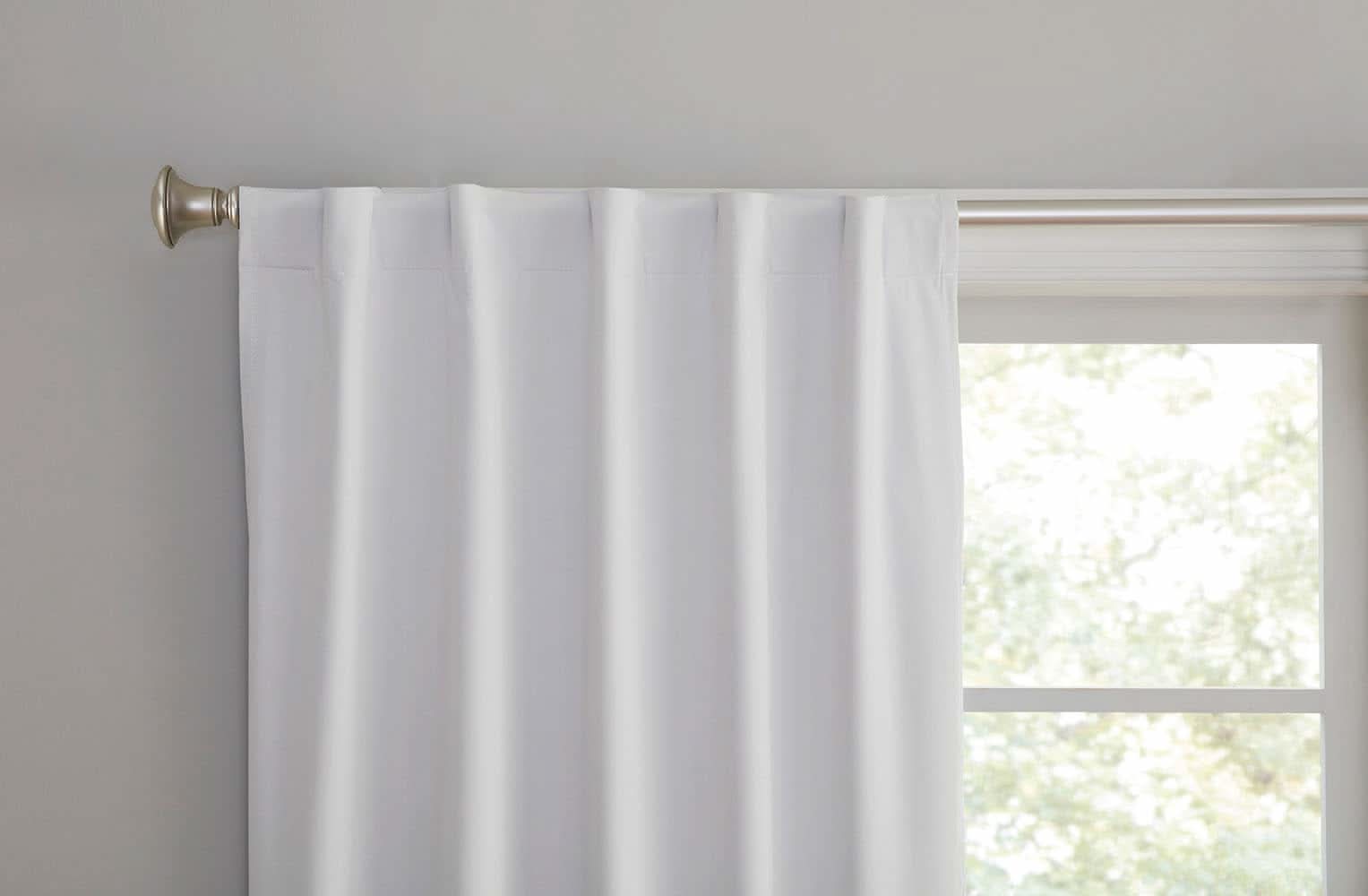 2 Pack Curtain Pair. Total Blackout. Insulating. Rod pocket with hidden back tabs. Hand wash cold with mild soap or detergent and hang to dry. Do not iron. Energy saving. Sound dampening. Recommended for residential use only. Use Location: Indoor Color: White