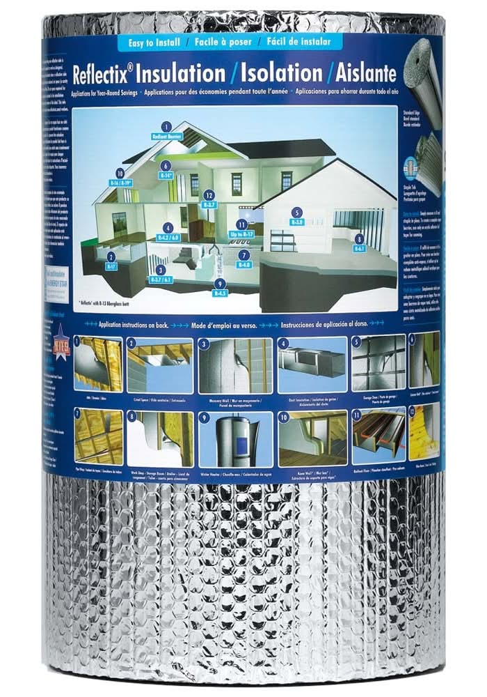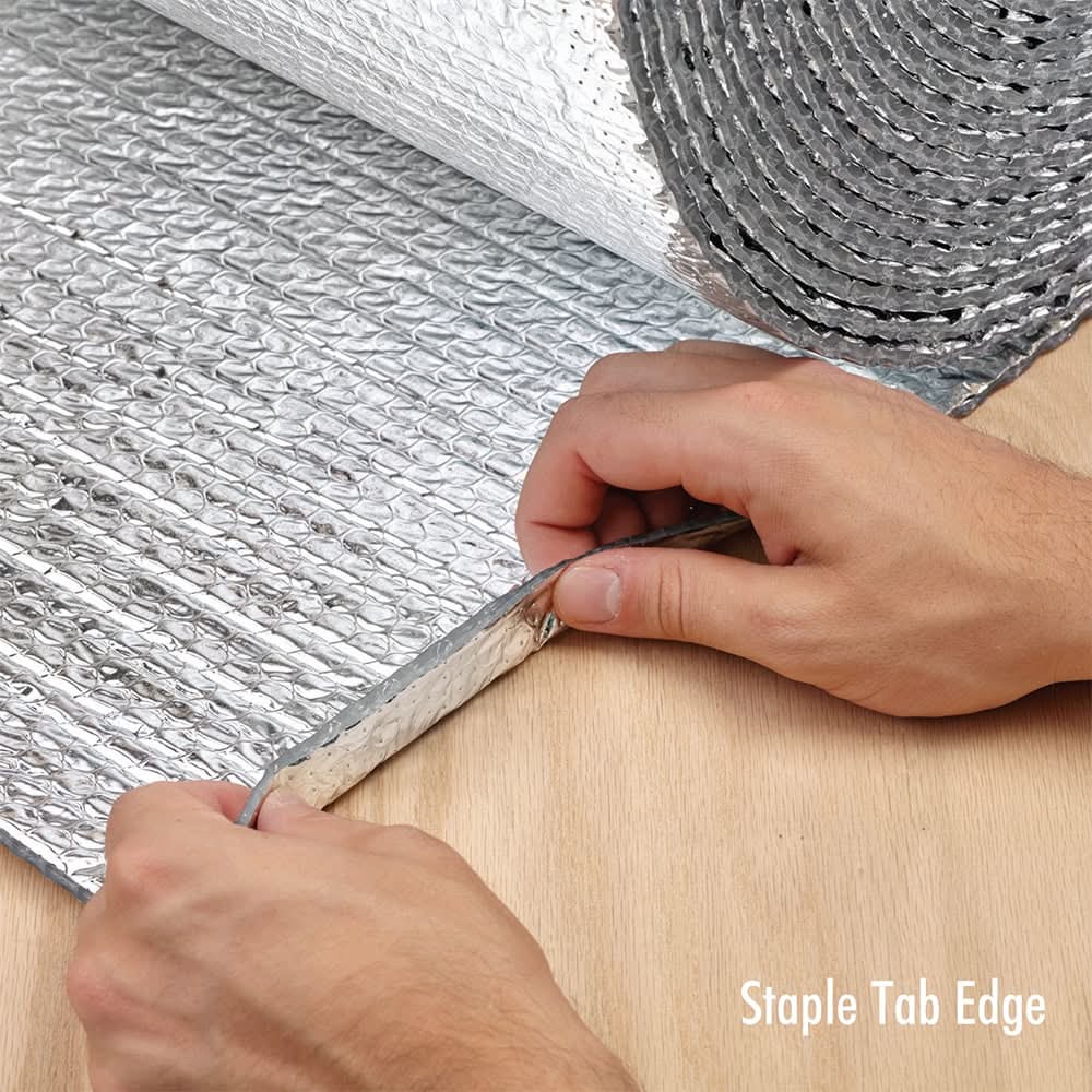 Double reflective, double bubble insulation with staple tab is easy to install on 16-in on center framing. R-values range from R-3.0 to R-21 depending on the applications. Applications: cathedral ceiling, crawl space, radiant floor, wall, HVAC duct, water pipe, garage door, knee wall and water heater. A tape measure, staple gun, utility knife and safety glasses are all you need for installation (not included). A fiber and itch free insulation product. Class A/Class 1 fire rating. Inhibits condensation and resists growth of fungi, mold and mildew. No nesting characteristics for birds, insects or rodents. Made at an ISO 9001:2008 manufacturing location.