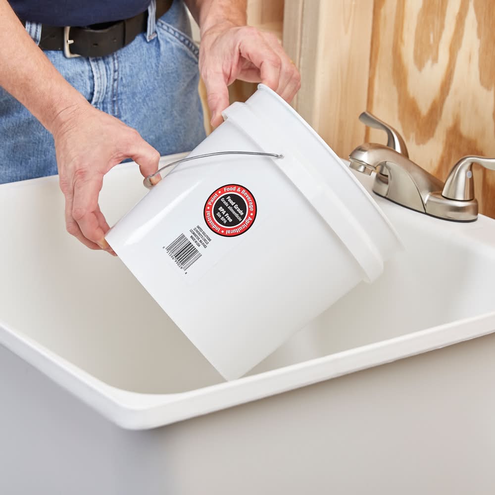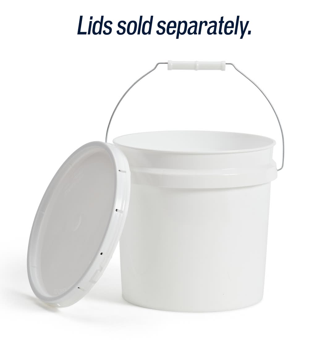 Each pail is designed with reinforced rings around the top for added stability and prevention of distortion when carried. Uniform wall thickness for added strength when stacked. Tapered design for easy separation and maximization of storage and shipping space. Can hold up to 2 gallons of liquid. Lowe's sells a 2 gallon lids (SKU 954440 and 970568) that fits this bucket. Product Dimensions - 10.25 in x 10.25 in x 9.25 in. Food grade. BPA Free. Color: White