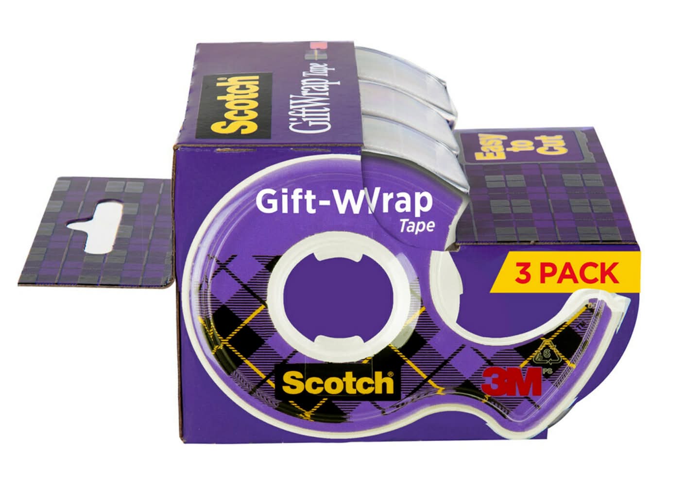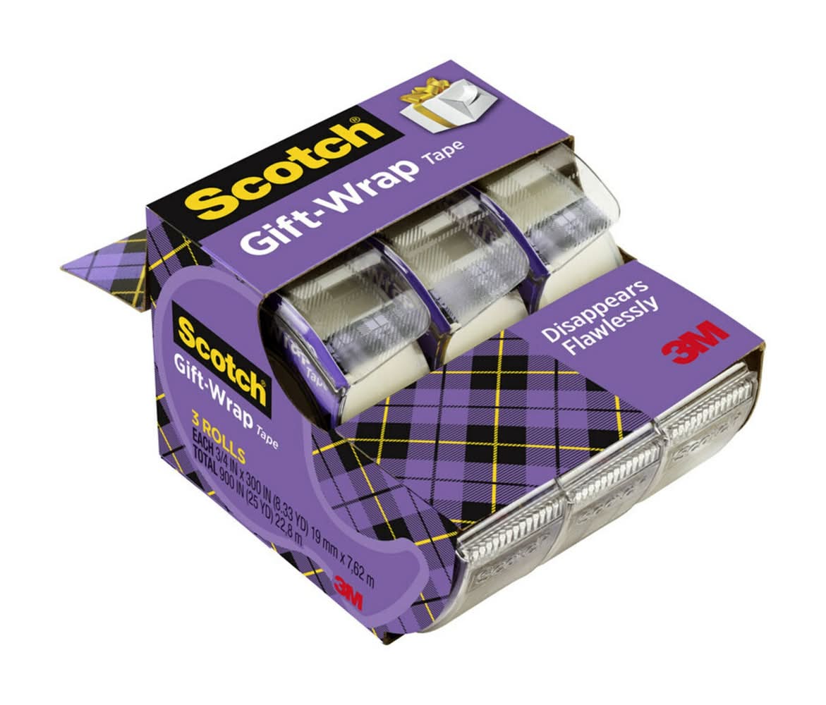 The original satin-finish, gift wrapping tape. Disappears on most gift wrap papers. Gives gifts a smooth, finished look. The go-to tape for the holidays. Refillable dispenser: Easy to hold, easy to cut. Strong and secure. Photo safe. Glides off roll smoothly, cuts easily. 3/4-in x 300-in, 3 Dispensers, 1-in core. Color: Clear