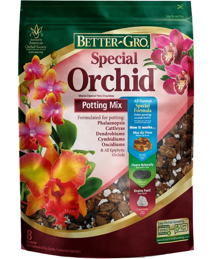 Formulated for potting: Phalaenopsis, Cattleyas, Dendrobiums, Cymbidiums, Oncidiums, and all Epiphytic Orchids. All natural special formula makes growing orchids easy. Contains fir bark for max air flow. Contains charcoal to clean naturally. Contains coarse perlite for fast drainage. Endorsed by the American Orchid Society.