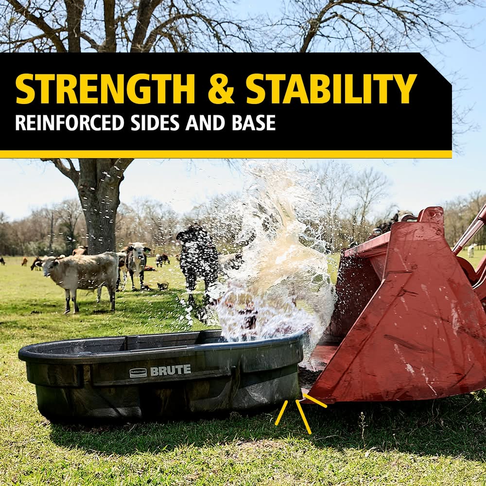 DURABLE RIGIDCELL CONSTRUCTION: For superior performance and long-lasting durability in all types of weather.. LEADING WARRANTY: Backed by 10 -Year Limited Warranty. MADE IN THE USA: Rubbermaid Commercial Products BRUTE Stock Tanks are proudly made in the USA.. RIBBED BASE: Robust structural ribbed design ensures durability and load-bearing capacity.. BUILT-IN BODY STIFFENERS: Provides body rigidity and helps to prevent deformation, supporting a longer product life.. ACCESSIBLE WATER SOURCE: Provides a reliable and accessible water source for livestock, including cattle, horses, and goats.. BRUTE Farm Products: Weather, Impact and Corrosion Resistant.. NO SHARP SURFACES: Smooth Tank surface to ensure animals are safe from any sharp or rough edges.. SHALLOW DESIGN: Features 12" height making stock tank ideal for smaller animals to drink out of. For CA Residents Only: WARNING: This product can expose you to chemicals including Lead which are known to the State of California to cause cancer and birth defects or other reproductive harm. For more information go to www.P65Warnings.ca.gov. Color: Black