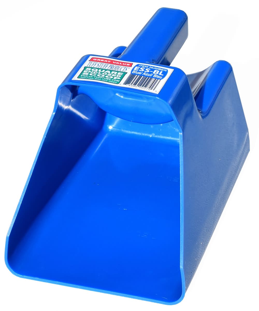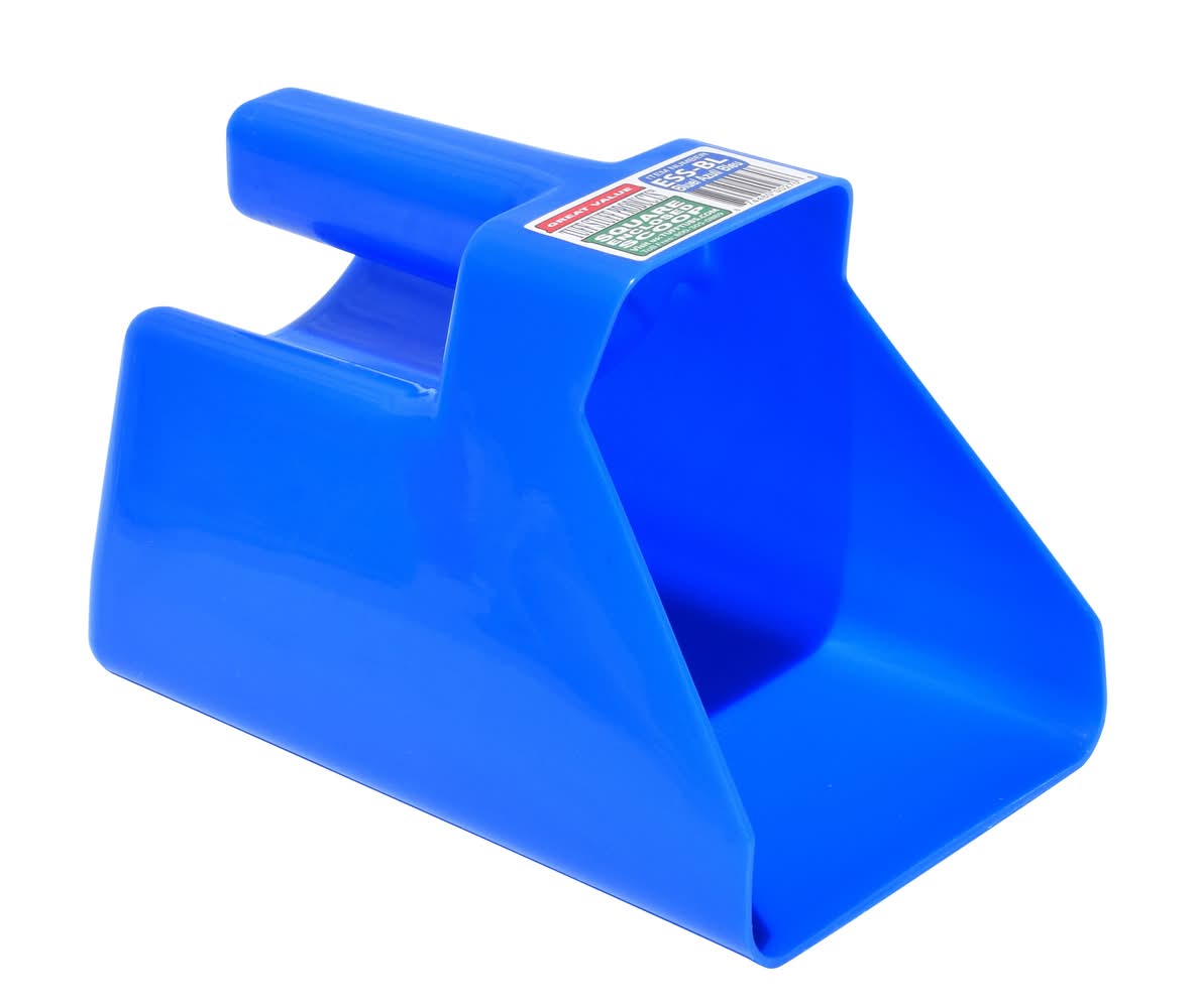The reinforced handle grip is designed to withstand heavy loads without cracking.. Ergonomic Design: Use your grip and thump to push and load the scoop and Easy on your wrist.. Great for getting to the bottom, because this scoop has a flat edge which allow you to scoop to the bottom every time.. Use Location: Indoor/Outdoor Color: Blue