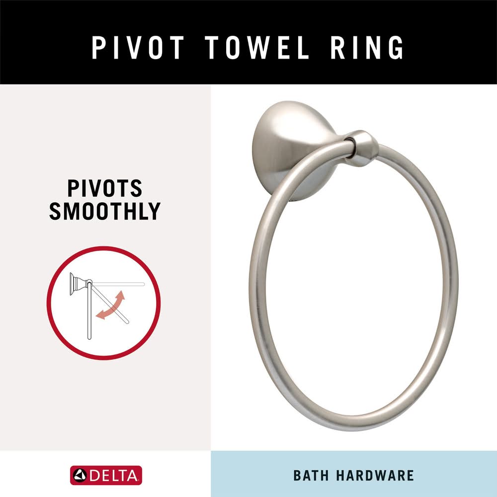 SPACE SAVING: Wall-mounted bath accessories maximize storage in limited spaces. FINISH: SpotShield brushed nickel is a spot-resistant, warm, muted silver finish with earthy undertones. KEEP IT CLEAN: SpotShield technology keeps hardware cleaner for longer by resisting water spots, fingerprints, and stains. DIMENSIONS: Towel ring measures 7.29-in H x 6.38-in W x 2.65-in D with set screw mounting. EASY INSTALL: All mounting hardware, template, and guide included. COORDINATE: Complete your look with the coordinating Foundations Bath Collection of accessories (sold separately). WARRANTY: Enjoy the look you love for life with Delta’s Limited Lifetime Warranty. Included mounting hardware and hanging template makes installation simple. Matches perfectly with the Delta Foundations Faucet.