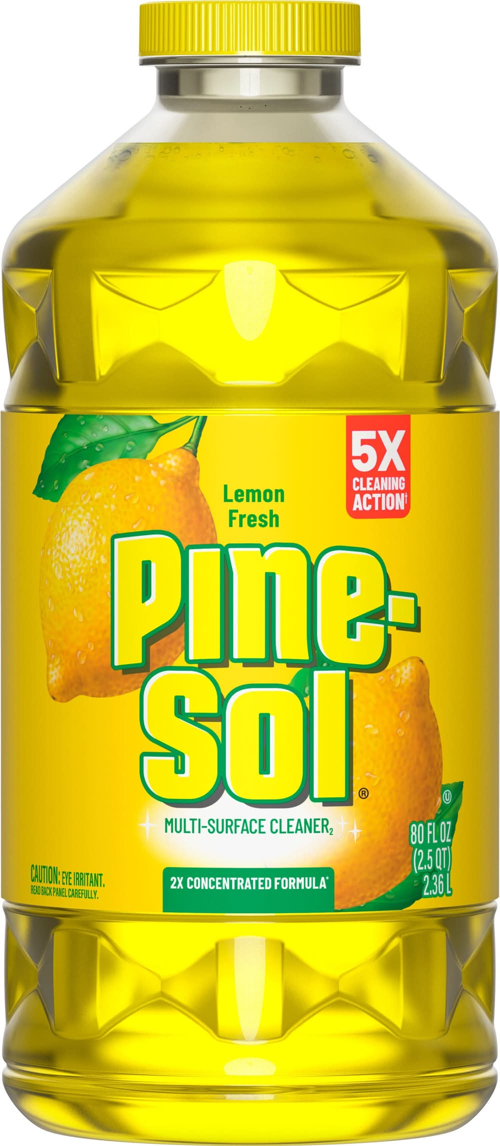 Cuts through dirt, grease and grime. Deodorizes and leaves a Lemon Fresh scent. Removes 99% of allergens (1). 5X CLEANING ACTION: Pine-Sol Multi-Surface Cleaner works hard so you don’t have to; it deodorizes, cuts through grease, removes grime, tackles tough dirt and removes 99% of allergens (1); pack may vary. LEMON FRESH SCENT: Revitalize your home with a fresh squeezed citrus fragrance; This Lemon Fresh scent is a delightful sensory experience that transports you to sundrenched lemon grove. MULTI-SURFACE CLEANER: Suitable for use on a variety of surfaces like finished wood, tile, stone, porcelain and more; use on countertops, sinks, garbage disposals, floors, furniture, walls and tubs. VALUE: One 80 fluid ounce bottle of Pine-Sol Multi-Surface Cleaner makes up to 80 gallons of cleaning solution, helping you tackle even the biggest cleaning jobs. 2X CONCENTRATED FORMULA (2): Power through tough dirt, grease and grime with this 2X concentrated formula compared to unconcentrated Pine Use Location: Indoor