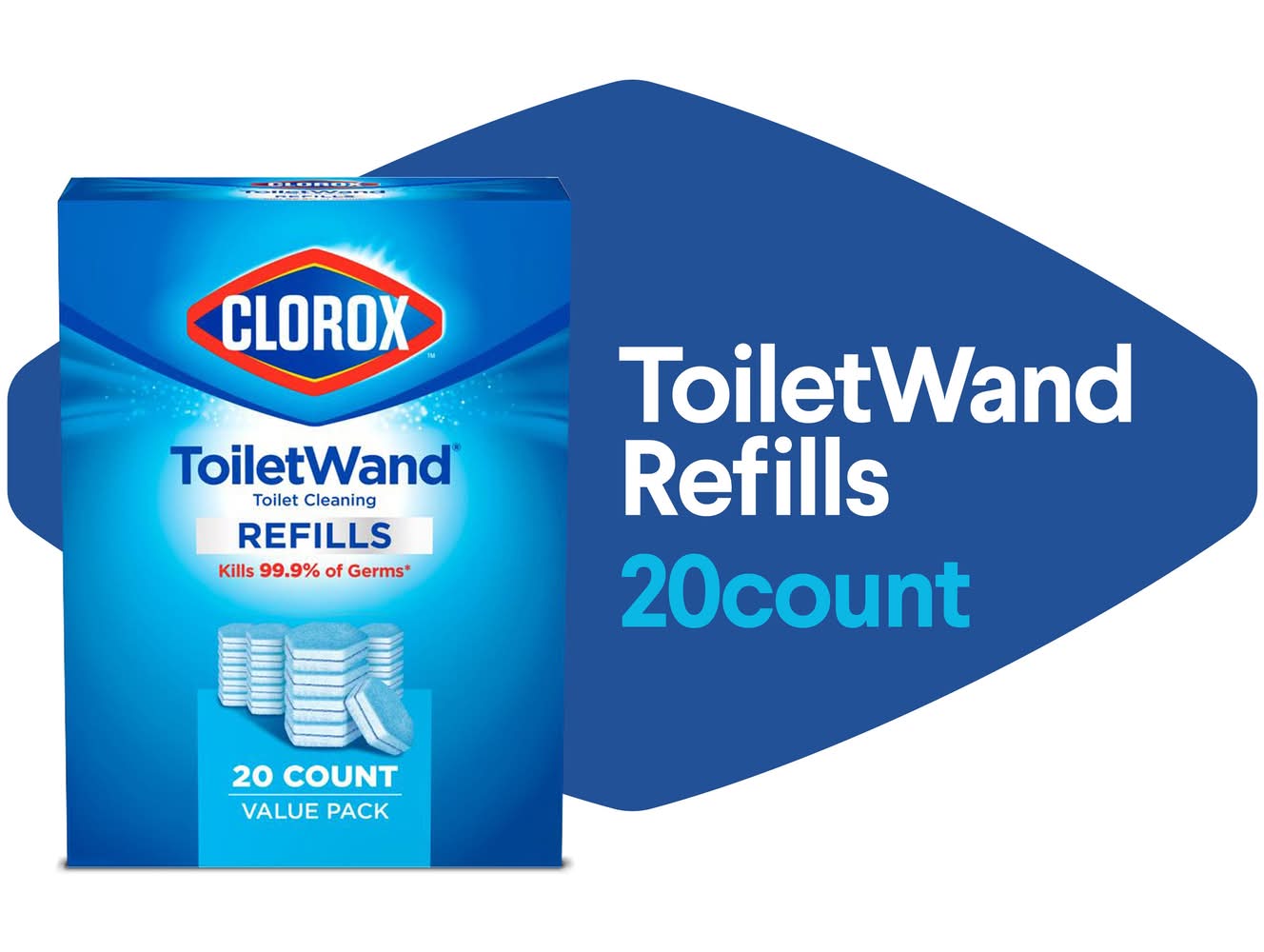 Clorox® ToiletWand® disinfecting refills. Kills 99.9% of germs*. Preloaded with cleaning solution. Eliminates hard water and lime stains. TOILET BOWL CLEANER: Clean and disinfect with Clorox® ToiletWand® Toilet Cleaning Refills that kill 99.9% of germs while leaving your toilet sparkling clean; pack may vary. PRELOADED WITH CLEANER: Replaces your liquid cleaner AND your brush; disposable scrubbing pads are preloaded with cleaner that kills 99.9% of germs* to make toilet cleaning fast and easy. ELIMINATE HARD WATER AND LIME STAINS: Powerful cleaning solution eliminates hard water and lime stains 2X faster than using a toilet brush with manual toilet bowl cleaner. DISPOSABLE SCRUBBING PADS: Never touch an icky toilet brush again with disposable scrubbing pads that conveniently pop off into the trash so you can toss the mess every time. BATHROOM CLEANING PRODUCTS: These ToiletWand® refills with Clorox® cleaner eliminate the need to carry around a bottle of cleaner and germ ridden to Packaging: Reusable