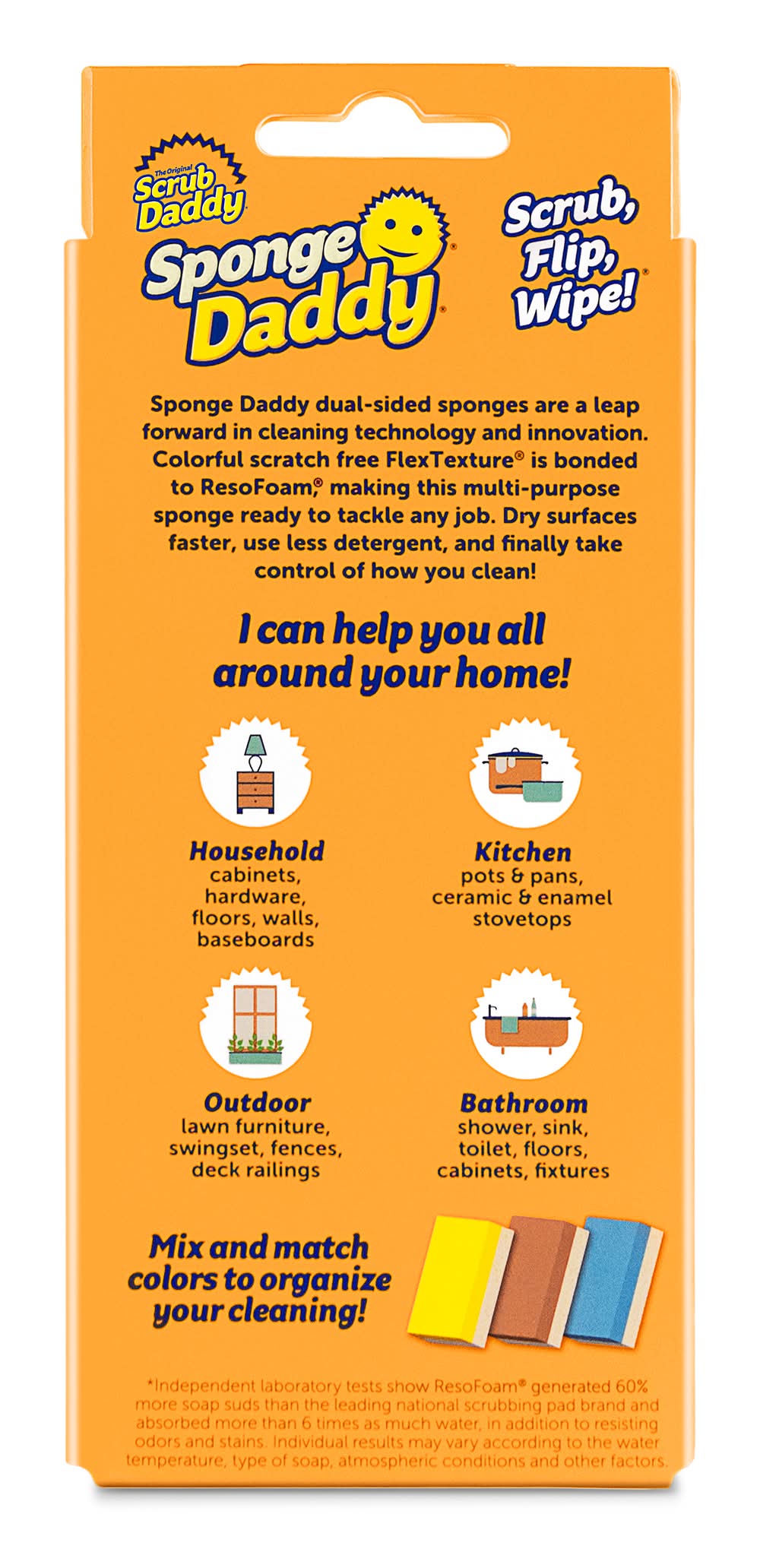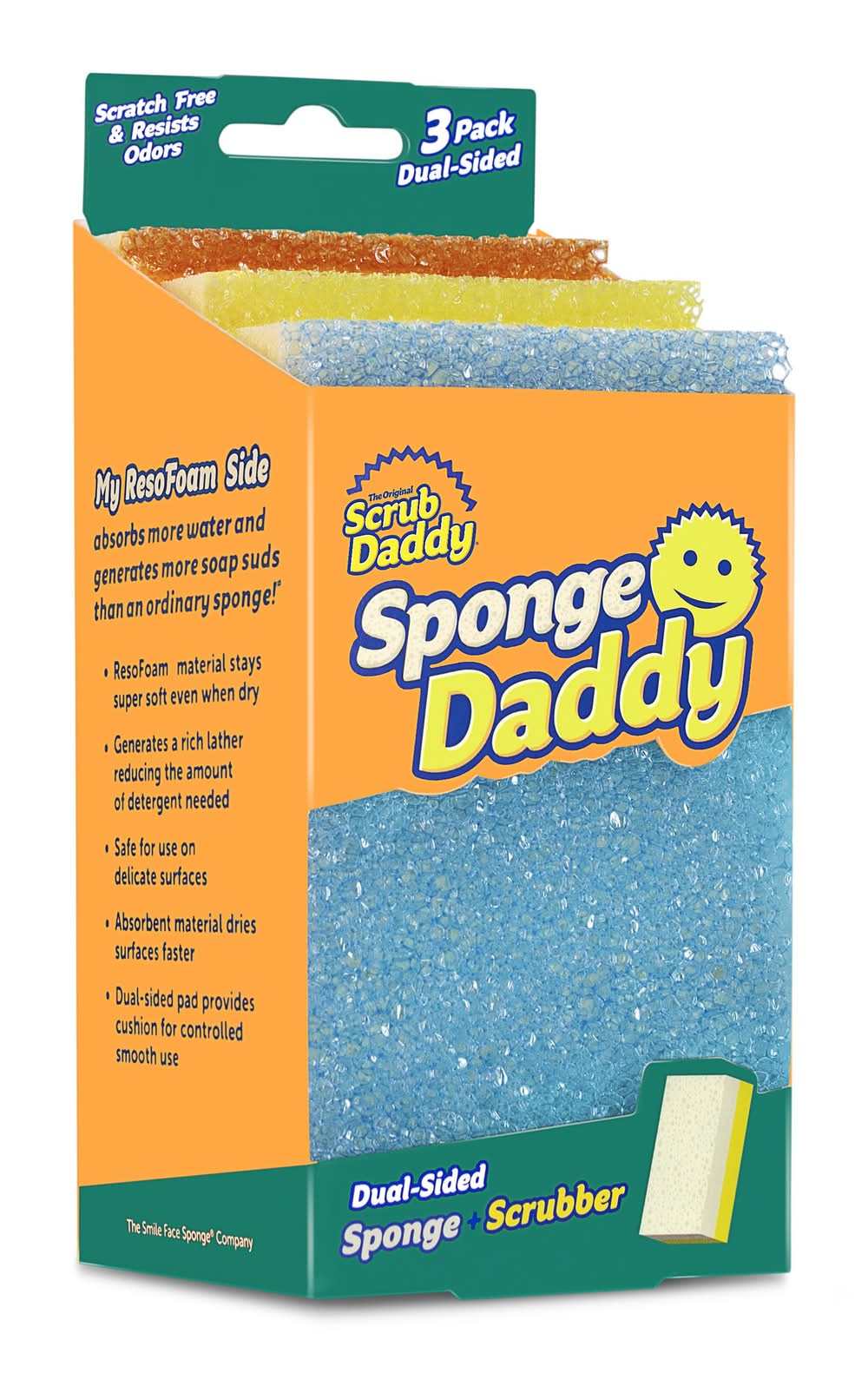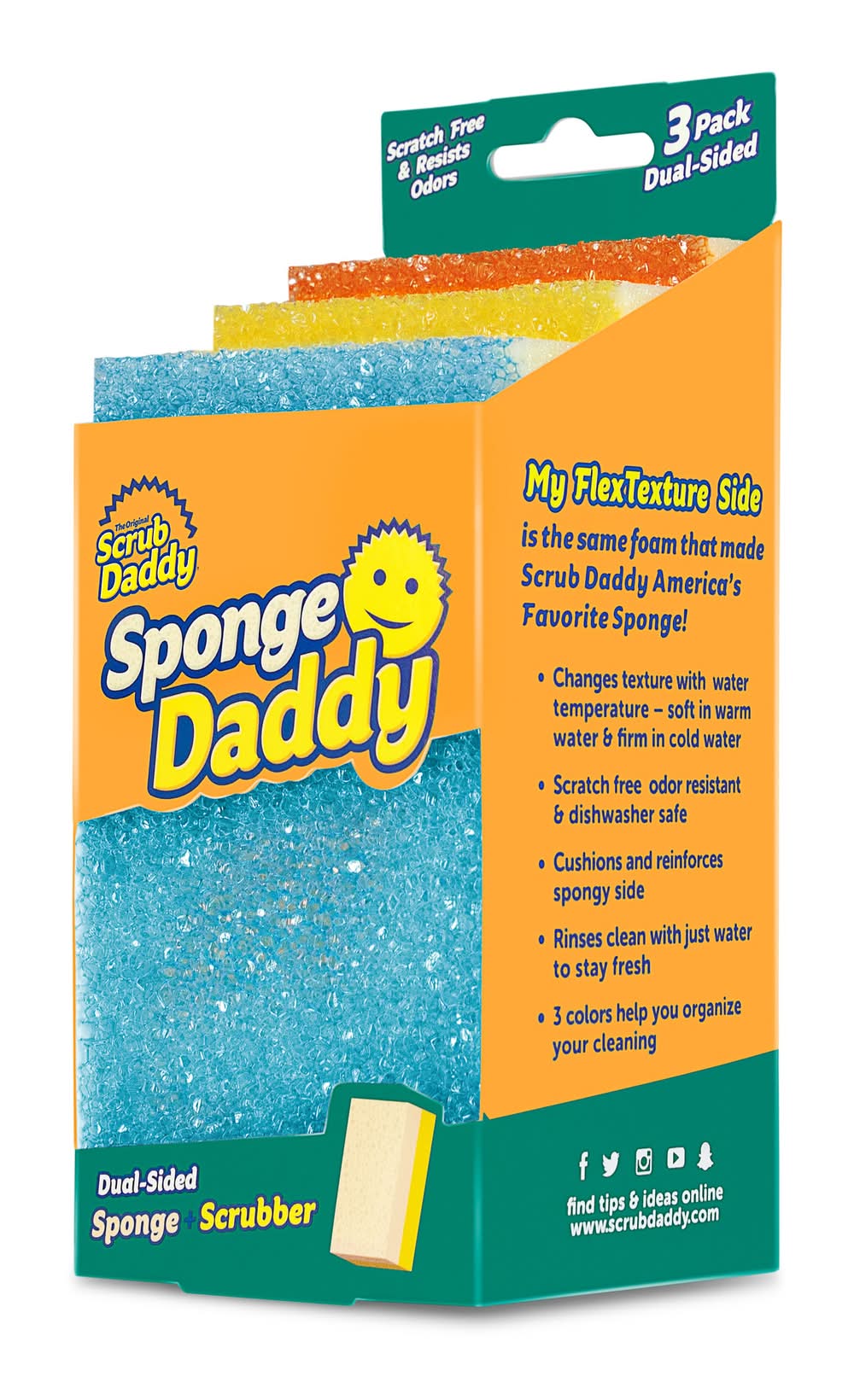 Sponge Daddy's FlexTexture® becomes firm in cold water for tough scrubbing and soft in warm water for light cleaning. Sponge Daddy is safe to use on over a dozen different surfaces, including glass, stainless steel, cast iron, and non-stick coatings. Sponge Daddy's ResoFoam® side is 6x more absorbent than the leading brand and produces 60% more soap suds. Sponge Daddy's FlexTexture® side is lab tested to remain odor free for up to 8 weeks. • Color: Multiple colors/finishes • Packaging: Reusable