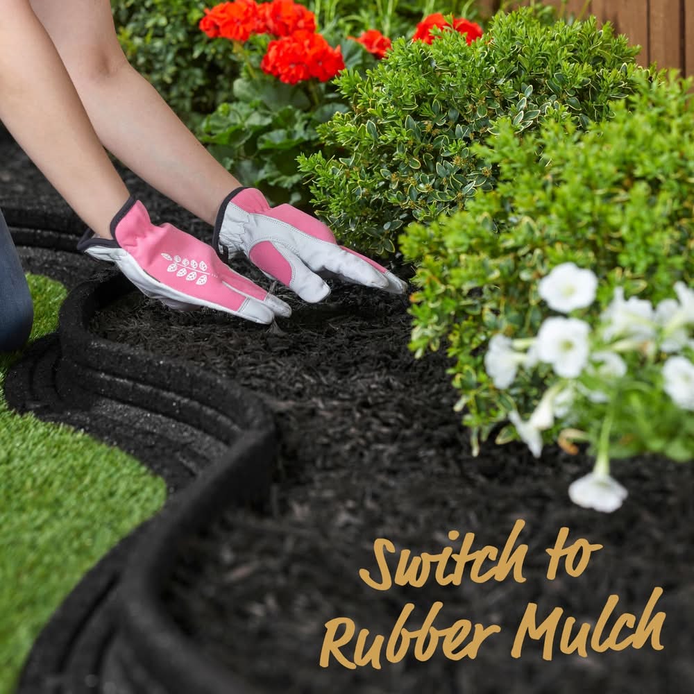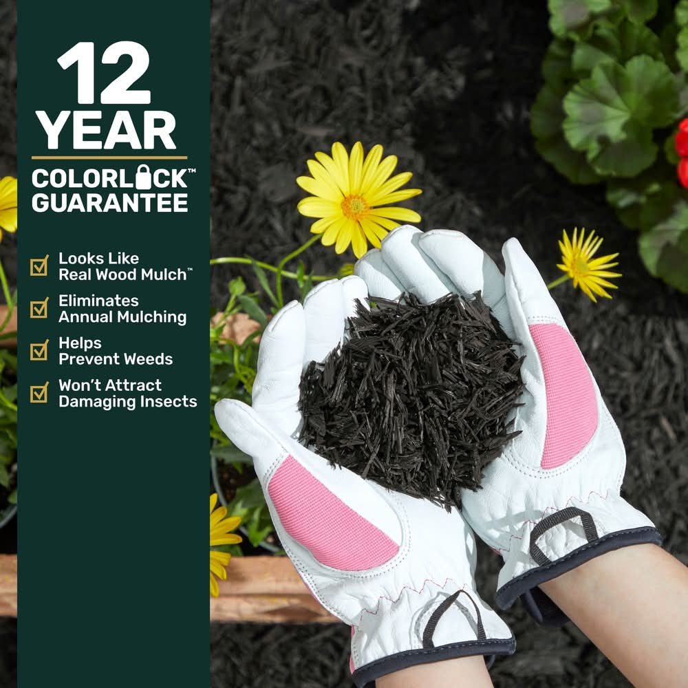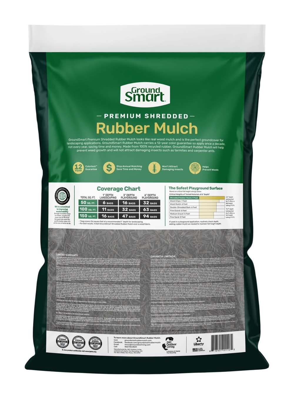 Helps prevent weeds. Eliminate annual mulching – save time and money!. Looks like real wood mulch. 12- year ColorLock Warranty. 3X the coverage of wood mulch – Covers 9.6 sq ft at 1” depth recommended for landscaping. Won’t attract damaging insects like termites, carpenter ants or other harmful wood destroying pests. Made in the USA from 100% recycled rubber. Certified safe for playgrounds. Tested and certified for: ASTM 1292-22, ASTM 3351-19, ASTM F3012-22. Safer for Kids: Yes Safer for Pets: Yes For CA Residents Only: WARNING: This product can expose you to chemicals including Lead which are known to the State of California to cause cancer and birth defects or other reproductive harm. For more information go to www.P65Warnings.ca.gov. Color: Black