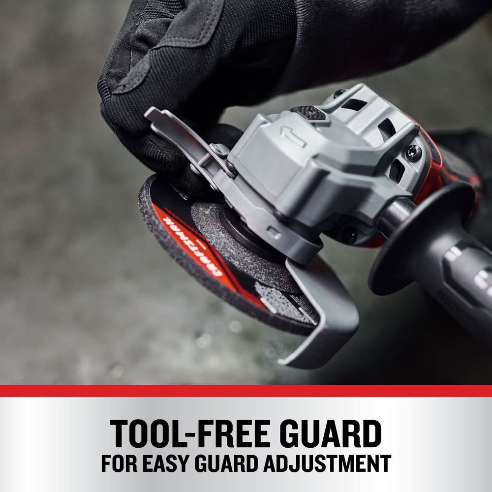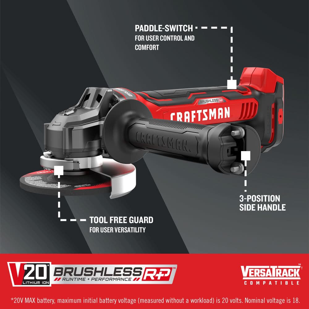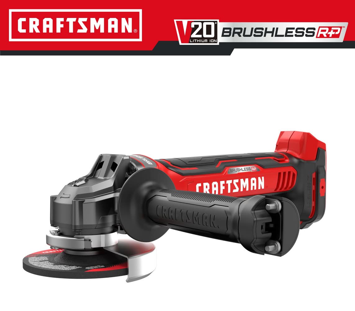 BRUSHLESS MOTOR: Up to 65% more power compared to CRAFTSMAN brushed Grinder CMCG400 by measuring the unit output measured in unit watts out (UWO) with 4.0 Ah battery (sold separately). CONTROL AND COMFORT: Paddle switch is made with the user in mind. QUICK GUARD ADJUSTMENT: Tool-free guard allows for easy adjustments. CONVENIENCE: 3-Position side handle offers ultimate ease. VERSATRACK™ COMPATIBLE: Use the clips (Sold Separately) to hang this tool directly on the VERSATRACK™ Wall Organization System (sold Separately). Maximum initial battery voltage (measured without a workload) is 20 volts, nominal voltage is 18. 3 Year Limited Warranty. Includes: (1) CMCG451 Angle Grinder. For CA Residents Only: WARNING: This product can expose you to chemicals including Lead which are known to the State of California to cause cancer and birth defects or other reproductive harm. For more information go to www.P65Warnings.ca.gov. Color: Red