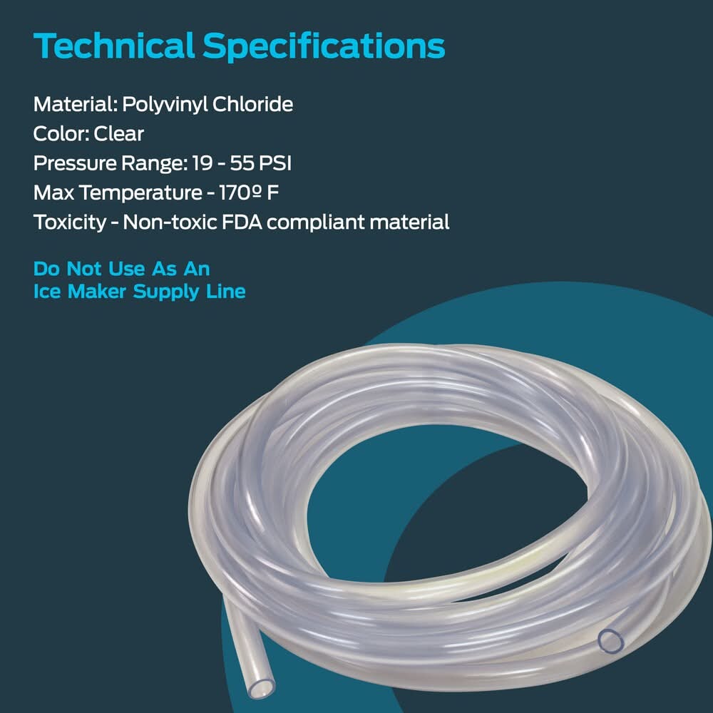 For use in drainage lines, potable water, beverage dispensing, laboratory tubing, and aquarium tubing. Great for low pressure applications. Manufactured with FDA compliant material. Can be used in potable water applications. Good chemical and corrosion-resistance. Operating conditions: 19 to 55 psi and 170-degrees F max. Sold in 1 ft increments, 30 ft in a roll. Diameter: 1 inch (inside diameter) 1-1/4 inch (outside diameter). Not recommended for use as an ice maker supply line. For CA Residents Only: WARNING: This product can expose you to chemicals including Lead which are known to the State of California to cause cancer and birth defects or other reproductive harm. For more information go to www.P65Warnings.ca.gov.