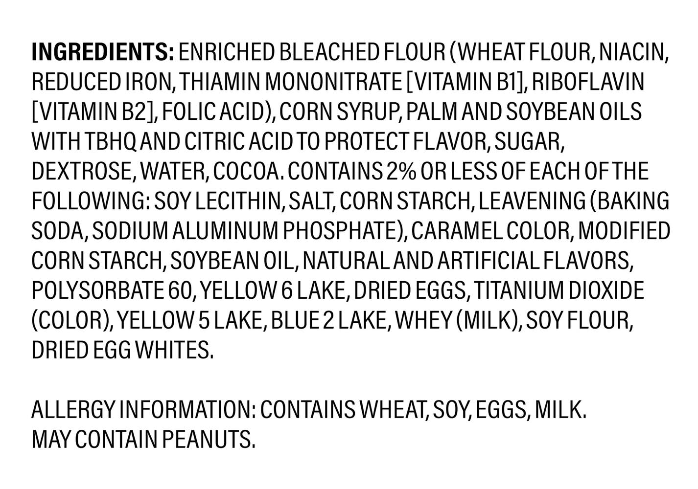 Ingredients: Enriched Bleached Flour (Wheat Flour, Niacin, Reduced Iron, Thiamin Mononitrate [Vitamin B1], Riboflavin [Vitamin B2], Folic Acid), Corn Syrup, Palm and Soybean Oils with TBHQ and Citric Acid to Protect Flavor, Sugar, Dextrose, Water, Cocoa, Contains 2% or Less of Each of the Following: Soy Lecithin, Salt, Corn Starch, Leavening (Baking Soda, Sodium Aluminum Phosphate), Caramel Color, Modified Corn Starch, Soybean Oil, Natural and Artificial Flavors, Polysorbate 60, Yellow 6 Lake, Dried Eggs, Titanium Dioxide (Color), Yellow 5 Lake, Blue 2 Lake, Whey (Milk), Soy Flour, Dried Egg Whites Contains: Wheat, Soybeans, Eggs, Milk, Peanuts