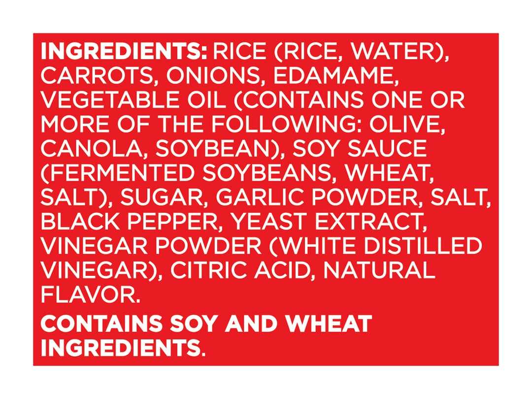 Ingredients: Rice (Rice, Water), Carrots, Onions, Edamame, Vegetable Oil (Contains One or More of the Following: Olive, Canola, Soybean), Soy Sauce (Fermented Soybeans, Wheat, Salt), Sugar, Garlic Powder, Salt, Black Pepper, Yeast Extract, Vinegar Powder (White Distilled Vinegar), Citric Acid, Natural Flavor Contains: Soybeans, Wheat