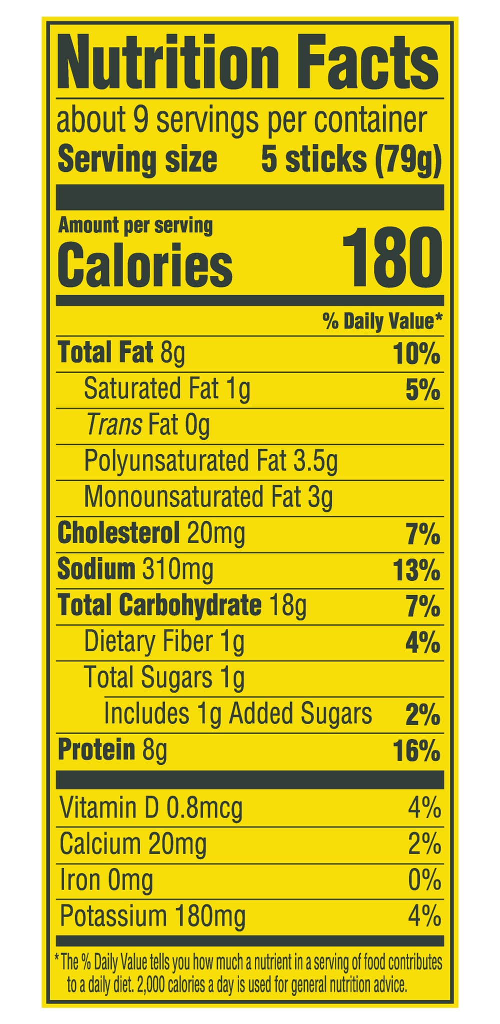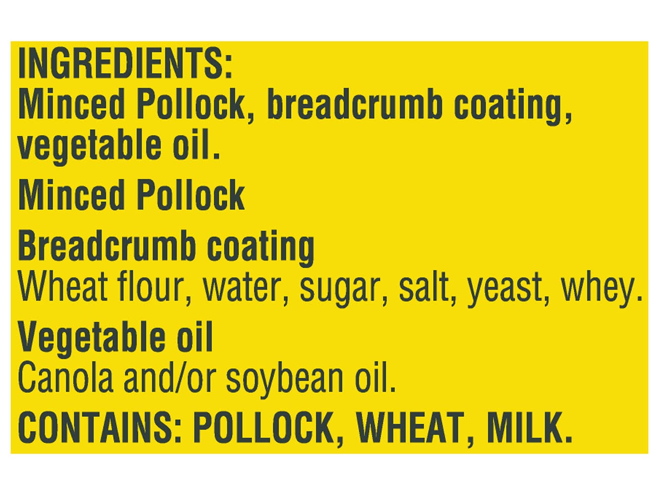 Ingredients: Minced Pollock, Breadcrumb Coating (Wheat flour, water, sugar, salt, yeast, whey), Vegetable Oil (Canola and/or Soybean Oil) Contains: Contains: pollock, wheat, milk.
