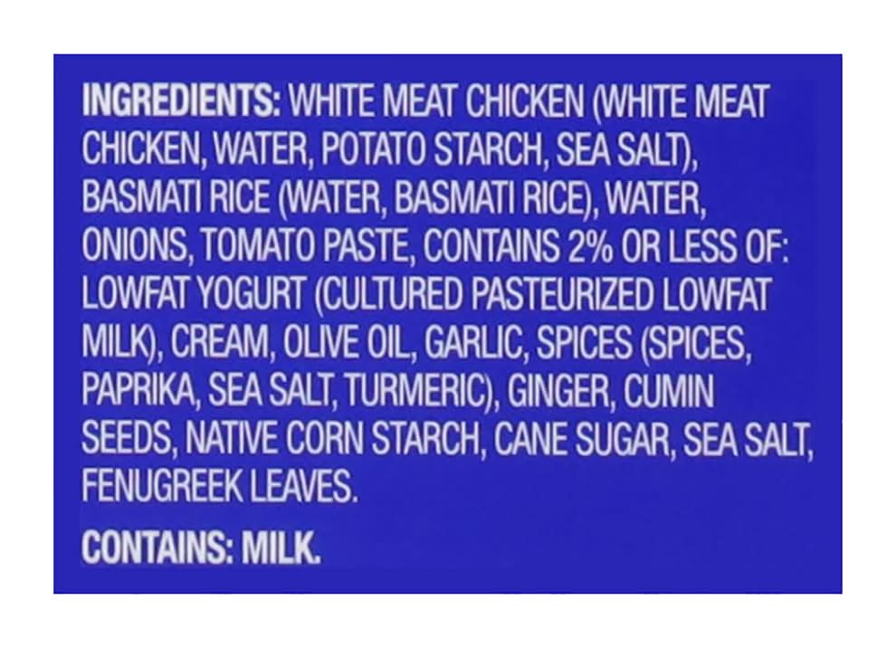 Ingredients: White Meat Chicken (White Meat Chicken, Water, Potato Starch, Sea Salt), Basmati Rice (Water, Basmati Rice), Water, Onions, Tomato Paste, Contains 2% or Less of: Lowfat Yogurt (Cultured Pasteurized Lowfat Milk), Cream, Olive Oil, Garlic, Spices (Spices, Paprika, Sea Salt, Turmeric), Ginger, Cumin Seeds, Native Corn Starch, Cane Sugar, Sea Salt, Fenugreek Leaves Contains: Milk