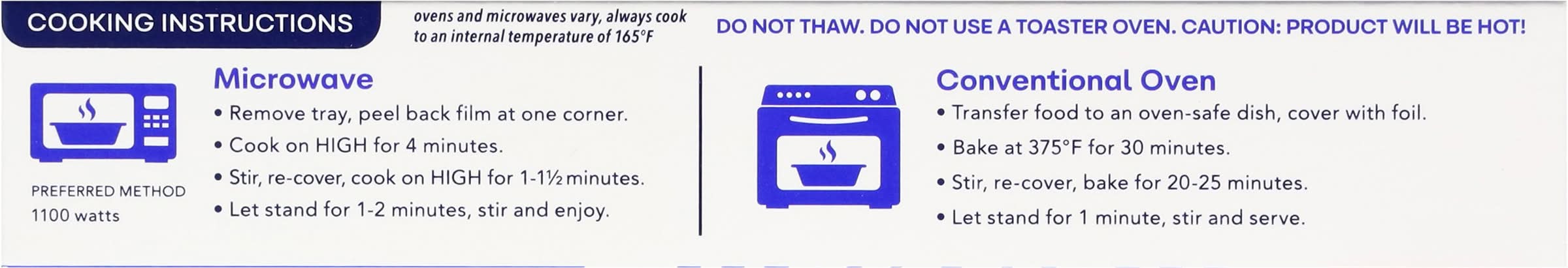 Directions for use: Cooking Instructions: Do not thaw. Do not use a toaster oven. Microwave: Preferred Method Microwave: 1100 watts. Remove tray from carton and peel back film at one corner for venting. Cook on high for 4 minutes. Peel film back enough to stir, replace film and cook on high for an additional 1 - 1-1/2 minutes. Let stand 1-2 minutes, stir and serve. Ovens and microwaves vary, always cook to an internal temperature of 165 degrees F. Conventional Oven: Preheat oven to 375 degrees F. Transfer food to an oven-safe dish an cover with foil. Cook for 30 minutes, stir an cook for an additional 20-25 minutes. Let stand 1 minute, stir and serve. Caution: Product will be hot Keep frozen. Storage recommendation: Keep frozen.