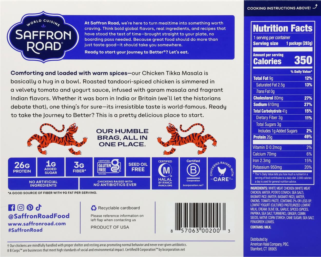 Roasted Chicken, Tandoori Spices & Creamy Sauce with Basmati Rice Explore the dish crowned by the British as their national dish. Did you know that... The wildly popular Chicken Tikka Masala is filled with more than delightful tandoori spices, it's filled with intrigue. The origin of this triumph of Indian cuisine remains a mystery. To some, its history stretches back 5,000 years to the first use of the tandoor, the Indian clay oven. To others, it is a modern invention created by the British. Whoever is right, our Chicken Tikka Masala is your journey to better culinary experiences on the Saffron Road. • American Halal Company Inc., Starmfort,CT,06905 • Packaging: Reusable