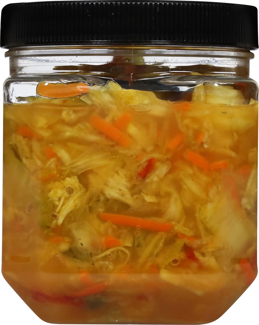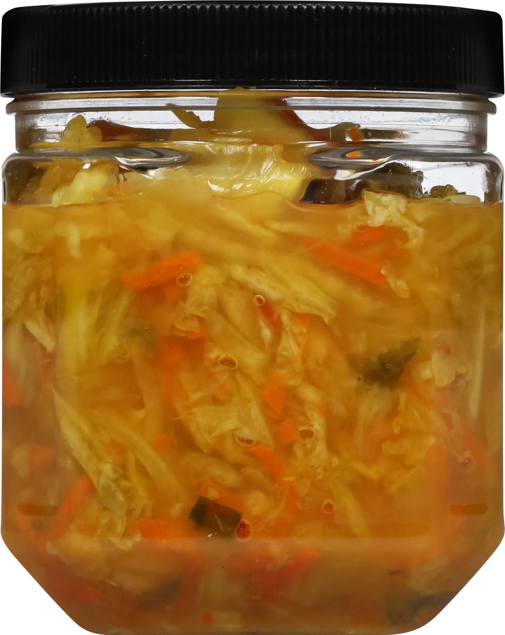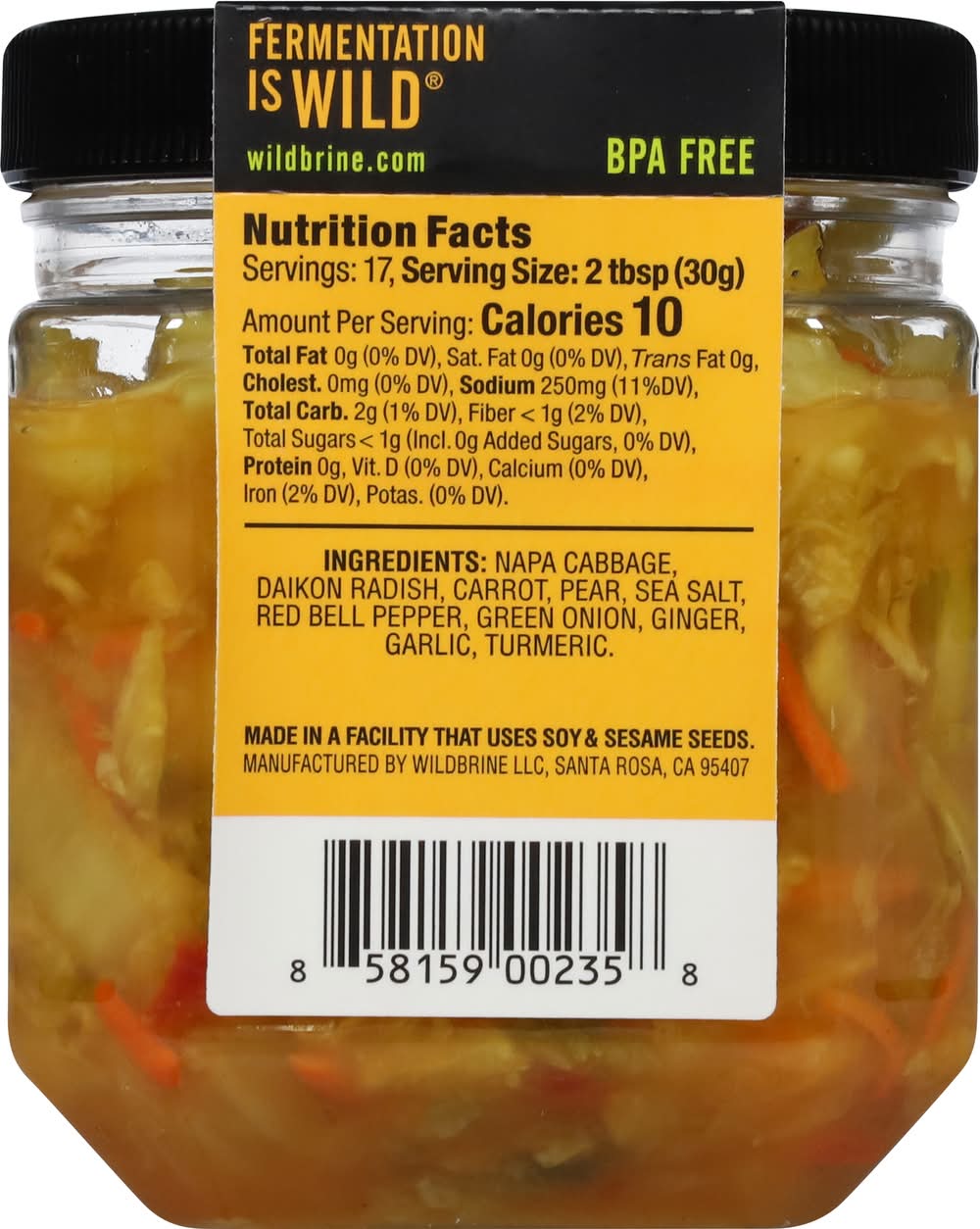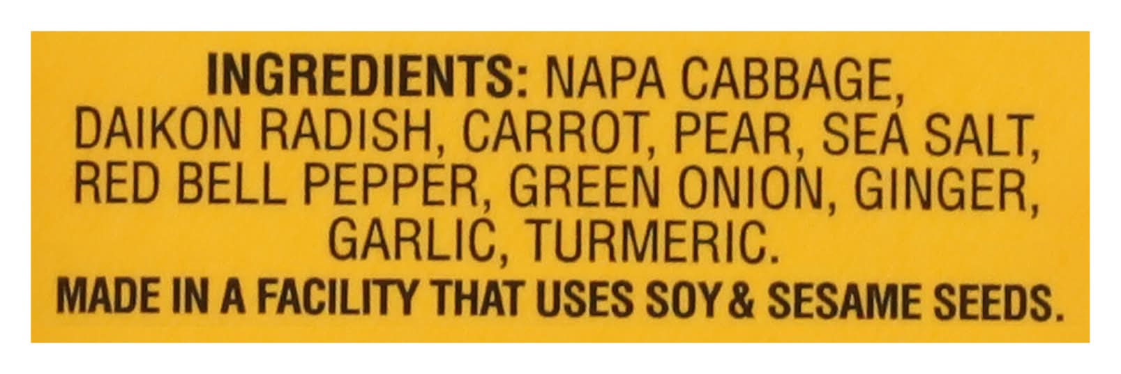 Ingredients: Napa Cabbage, Daikon Radish, Carrot, Pear, Sea Salt, Red Bell Pepper, Green Onion, Ginger, Garlic, Turmeric Contains: Soybeans, Sesame