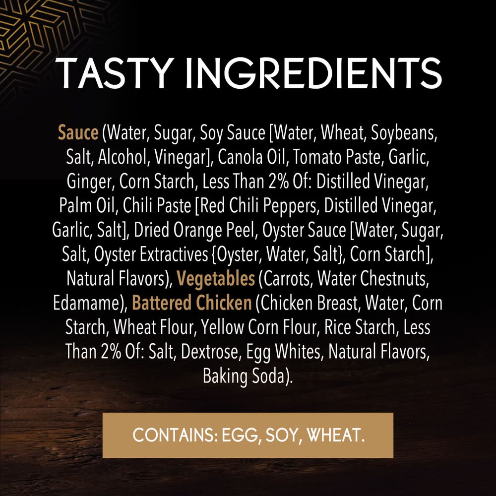 Ingredients: Sauce (Water, Sugar, Soy Sauce [Water, Wheat, Soybeans, Salt, Alcohol, Vinegar], Canola Oil, Tomato Paste, Corn Starch, Garlic, Less Than 2% Of: Ginger, Distilled Vinegar, Dried Orange Peel, Chili Paste [Red Chili Peppers, Distilled Vinegar, Garlic, Salt], Gelatin, Oyster Sauce [Water, Sugar, Salt, Oyster Extractives {Oyster, Water, Salt}, Corn Starch], Natural Flavors), Vegetables (Carrots, Water Chestnuts, Edamame), Battered Chicken (Chicken Breast, Water, Corn Starch, Wheat Flour, Yellow Corn Flour, Rice Starch, Less Than 2% Of: Salt, Dextrose, Egg Whites, Natural Flavors, Baking Soda), . CONTAINS: EGG, SOY, WHEAT. Contains: Egg, Shellfish, mollusk - oyster (Canada and EU), Soy, Wheat