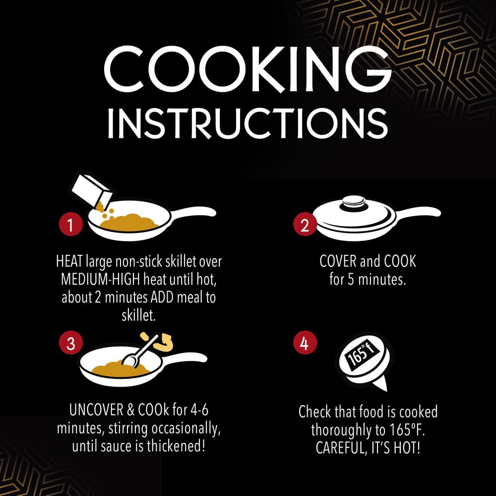 Directions for use: Cook thoroughly. Stove Top: Cook only one bag at a time. For Food Safety & Quality: Keep frozen. Do not thaw. Appliances vary. Adjust cooking times as needed. 1. Heat large non-stick skillet over medium-high heat until hot, about 2 minutes. Add meal to skillet. 2. Cover and cook 4 minutes. 3. Uncover and continue cooking 4 to 6 minutes, stirring occasionally, until sauce is thickened. 4. Check that food is cooked thoroughly to 165 degrees F. Careful, it's hot! Serve and enjoy! Keep frozen. Storage recommendation: Keep frozen.