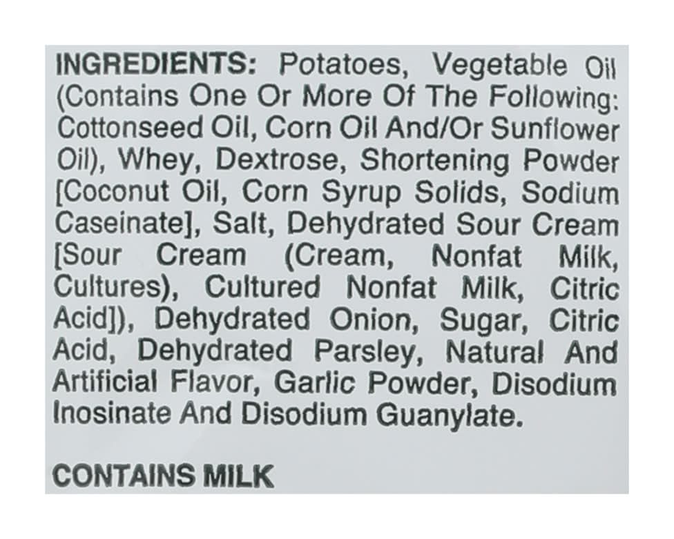 Ingredients: Potatoes, Vegetable Oil (Contains One or More of the Following: Cottonseed Oil, Corn Oil and/or Sunflower Oil), Whey, Dextrose, Shortening Powder [Coconut Oil, Corn Syrup Solids, Sodium Caseinate], Salt, Dehydrated Sour Cream [Sour Cream (Cream, Nonfat Milk, Cultures), Cultured Nonfat Milk, Citric Acid]), Dehydrated Onion, Sugar, Citric Acid, Dehydrated Parsley, Natural and Artificial Flavor, Garlic Powder, Disodium Inosinate and Disodium Guanylate Contains: Milk, Corn, Tree Nuts, Coconuts
