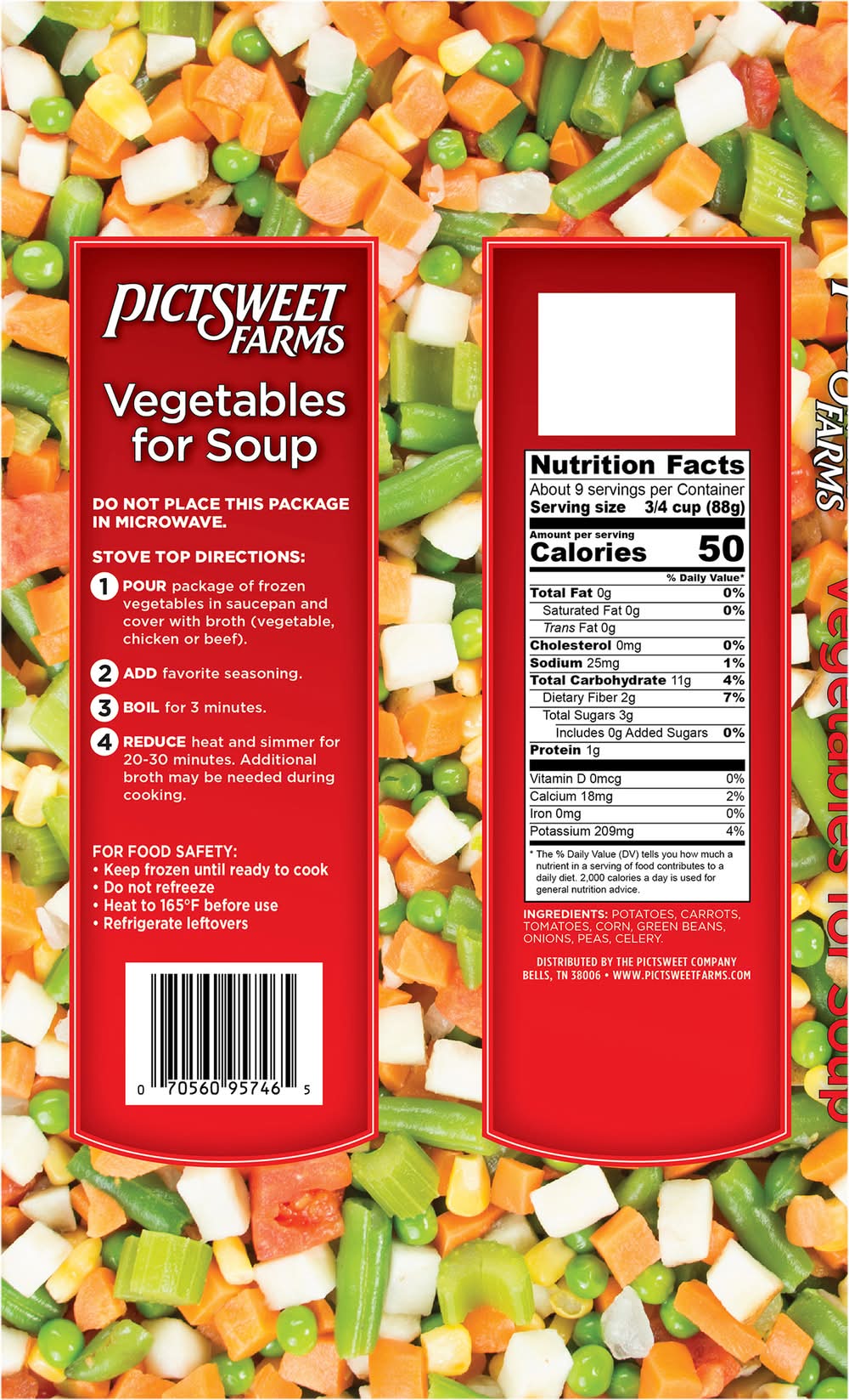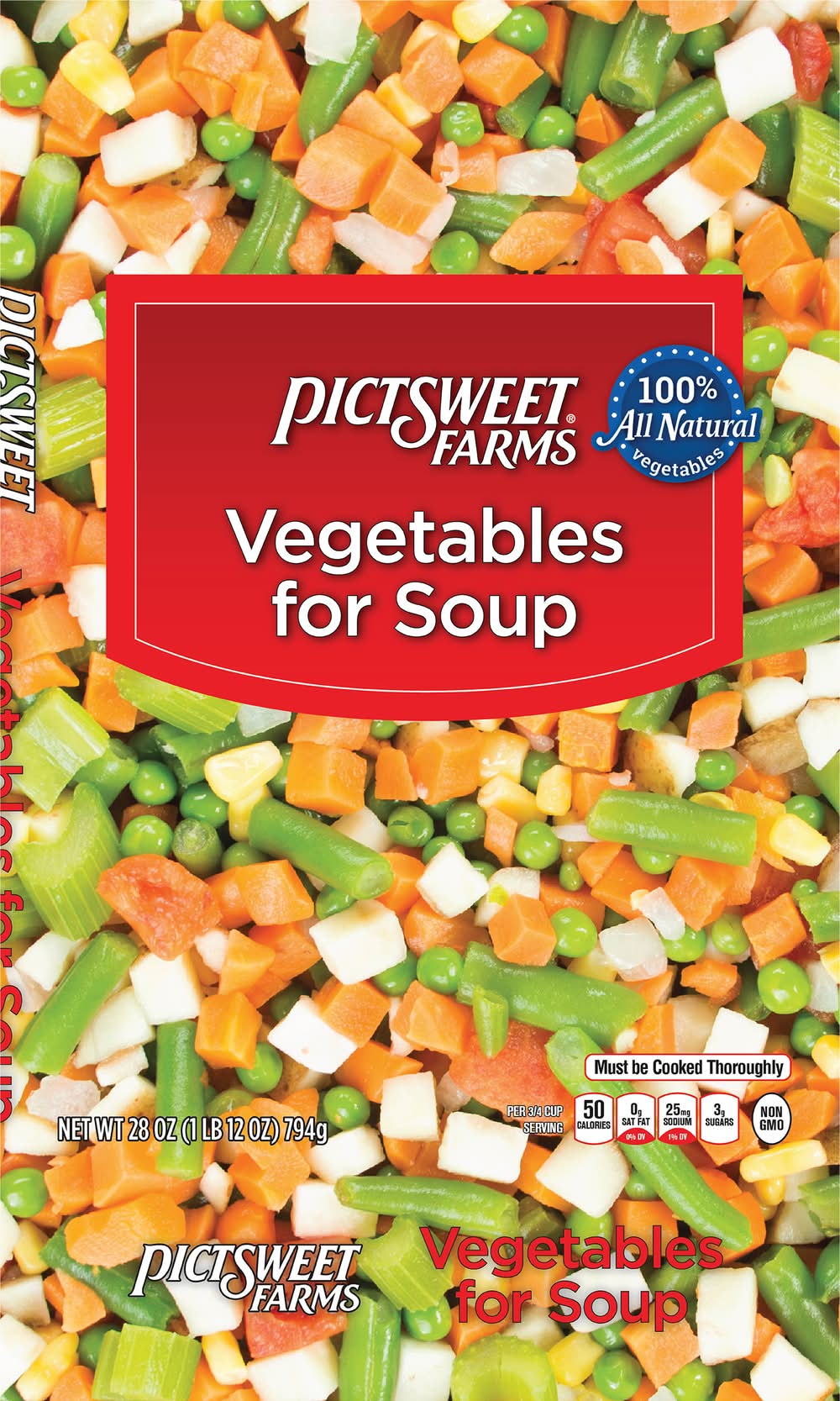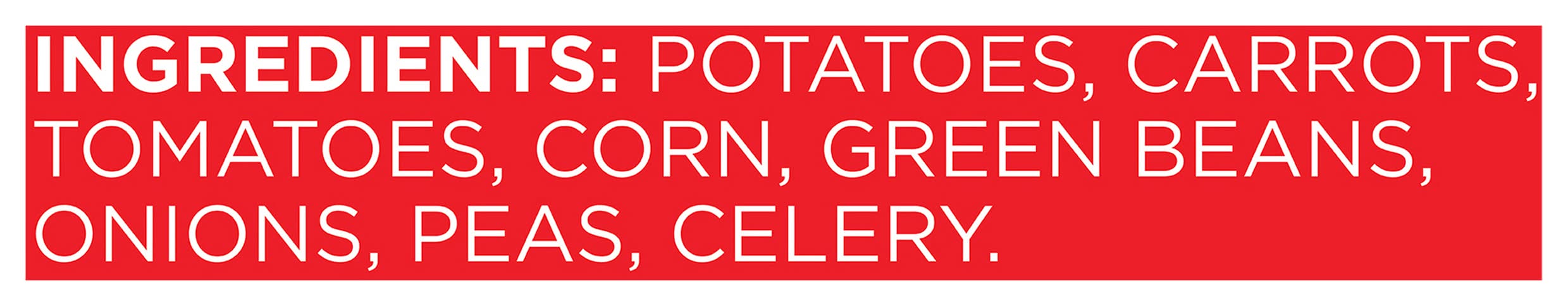 Ingredients: Potatoes, Carrots, Tomatoes, Corn, Green Beans, Onions, Peas, Celery Contains: Celery