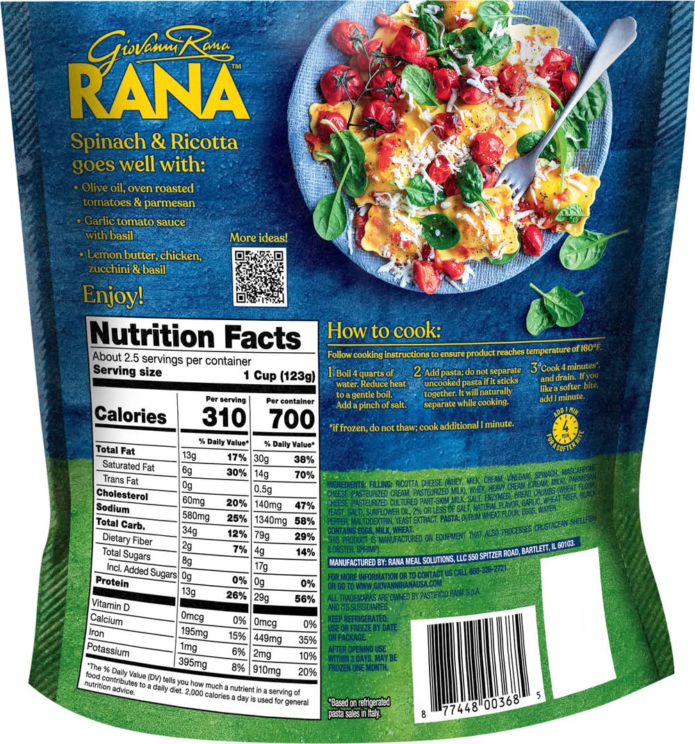 Rana Ravioli Spinach Ricotta • Flavor: Spinach-ricotta • Rana Meal Solutions, LLC, 550 Spitzer Road, Bartlett, IL, 60103