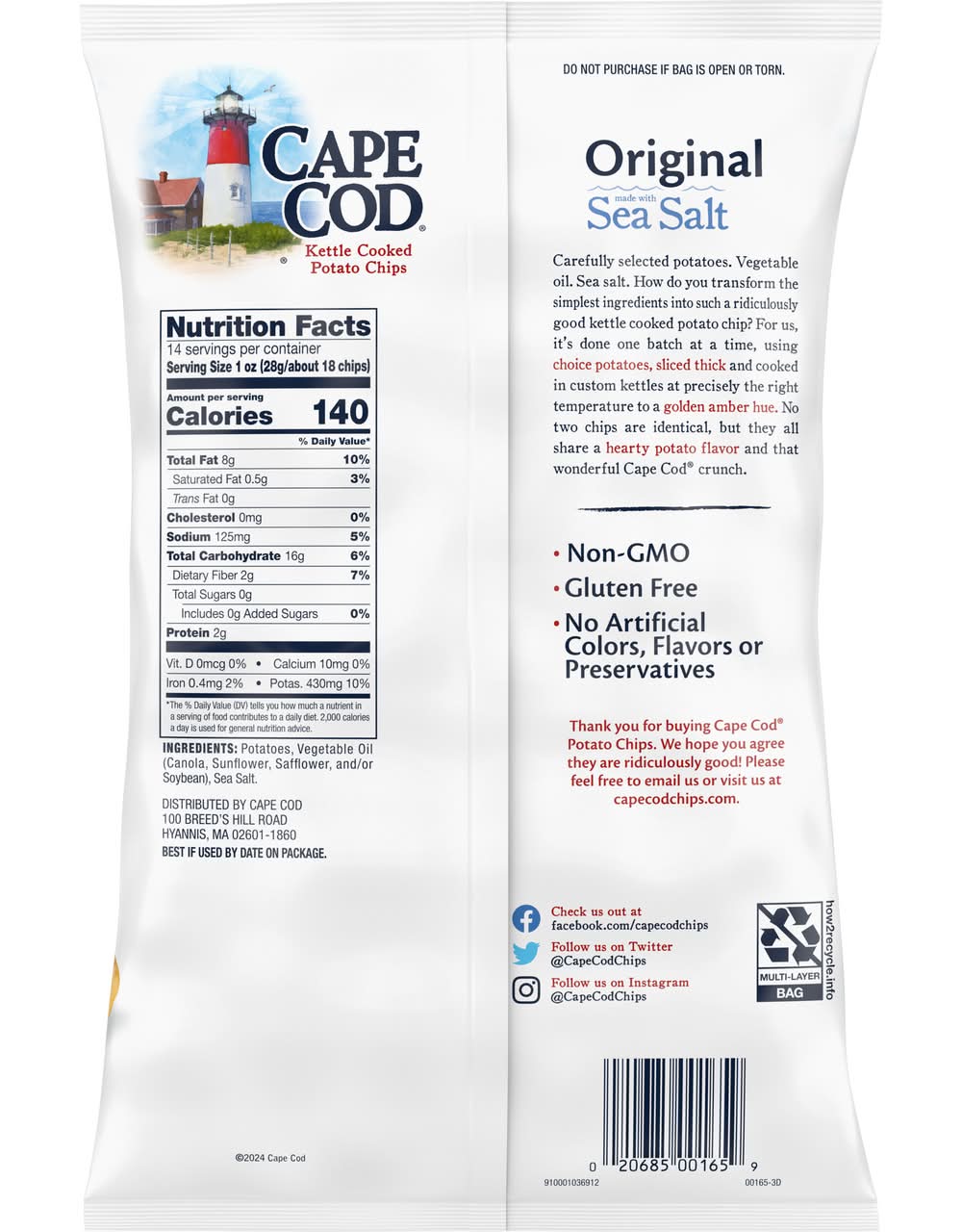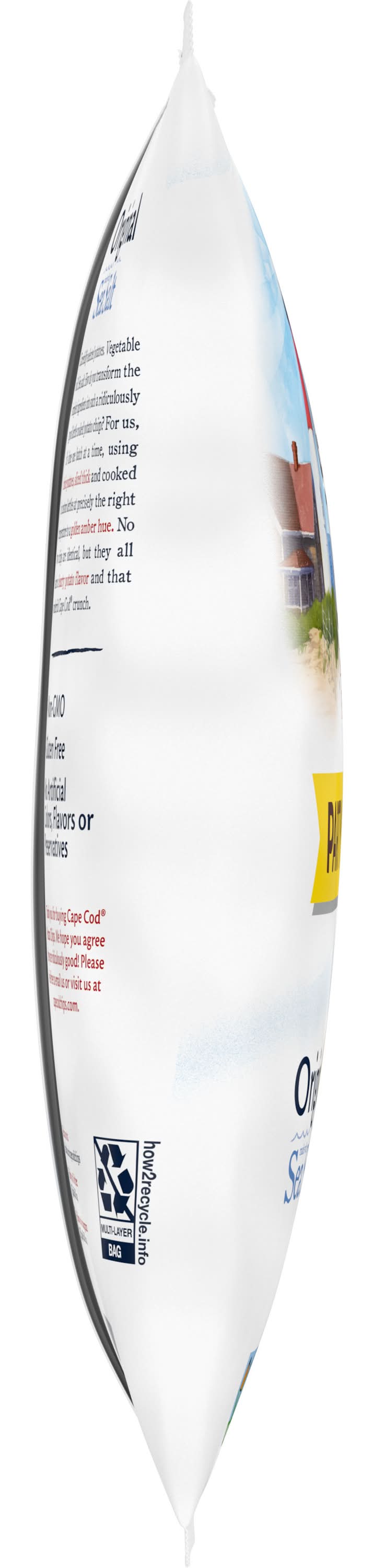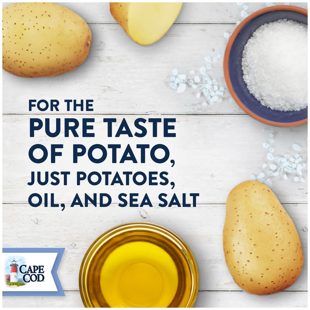 Cape Cod Original Kettle Cooked Chips are made with the pure taste of potato. And you can be sure there’s nothing else like them when it comes to their robust flavor and distinctive crunch. We take choice potatoes and slice them perfectly. Then, they’re cooked, one batch at a time, in custom kettles. You can count on potato chips that are cooked precisely at the right temperature until they reach a golden-amber hue. You’ll see that unique shapes and folds mean chips, all share the same, wonderful Cape Cod crunch. With the 14 ounce Party Size bag, you can make sure this crowd pleasing combination is ready for sharing at any gathering picnics, BBQs, a day at the beach. Our potato chips are famous for their high quality and remarkable flavor, so be sure to try all the traditional and unique varieties. Every distinctive chip feels like an invitation to come savor everything that’s special about Cape Cod Kettle Cooked Chips. • Flavor: Sea salt • Cape Cod, 100 Breed's Hill Road,Hyannis,MA • Packaging: Reusable