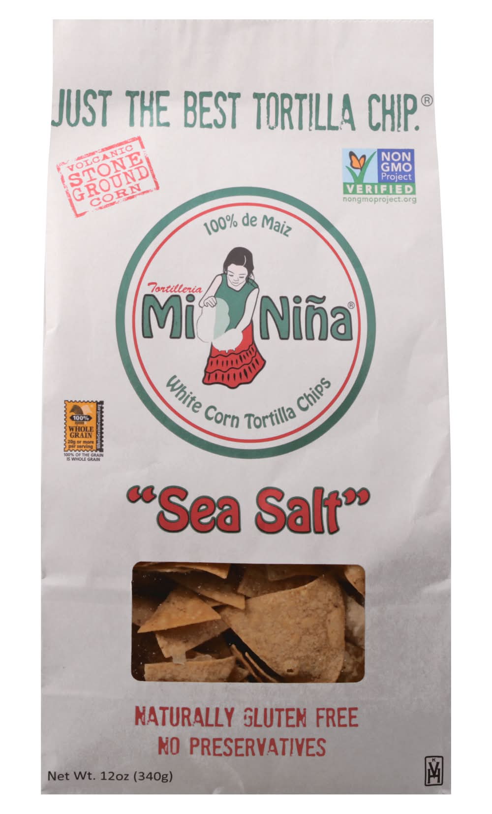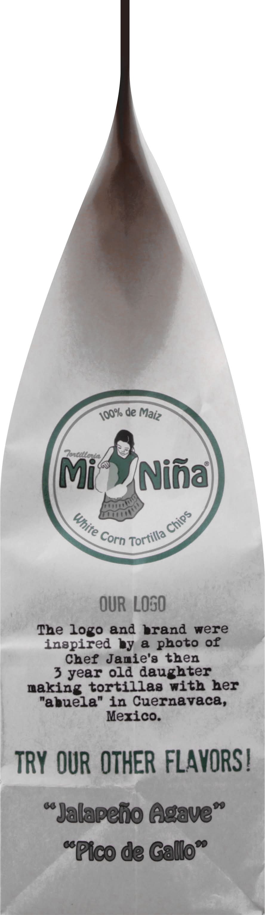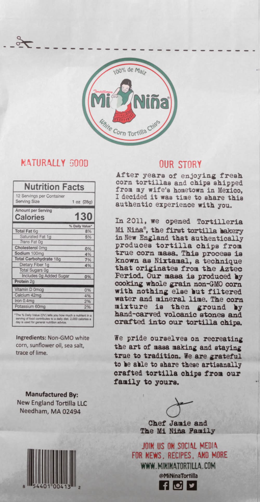100% Whole Grain: 20 g or more per serving. 100% of the grain is whole grain. Naturally Gluten free. No preservatives. Just the best tortilla chip. Volcanic stone ground corn. Naturally good. Our Story: After years of enjoying fresh corn tortillas and chips shipped from my wife's hometown in Mexico, I decided it was time to share this authentic experience with you. In 2011, we opened Tortilleria Mi Nina the first tortilla bakery in New England that authentically produces tortilla chips from true corn masa. This process is known as Nixtamal, a technique that originates from the Aztec Period. Our masa is produced by cooking whole grain non-GMO corn with nothing else but filtered water and mineral lime. The corn mixture is then ground by hand-carved volcanic stones and crafted into our tortilla chips. We pride ourselves on recreating the art of masa making and staying true to tradition. We are grateful to be able to share these artisanally crafted tortilla chips from our family to yours. Chef Jamie and the Mi Nina Family. Our Logo: The logo and brand were inspired by a photo of chef Jamie’s then 3 year old daughter making tortillas with her abuela in Cuernavaca. Flavor: Sea salt