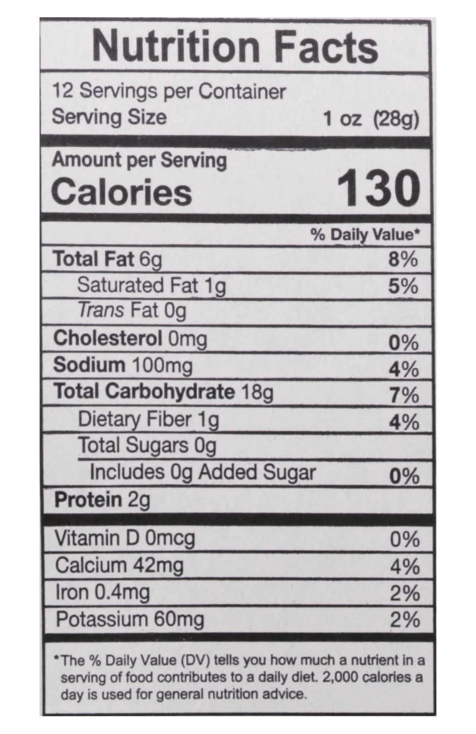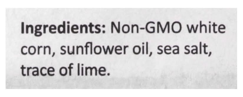 Ingredients: Non-GMO White Corn, Sunflower Oil, Sea Salt, Trace of Lime Contains: Corn (Maize), Soy